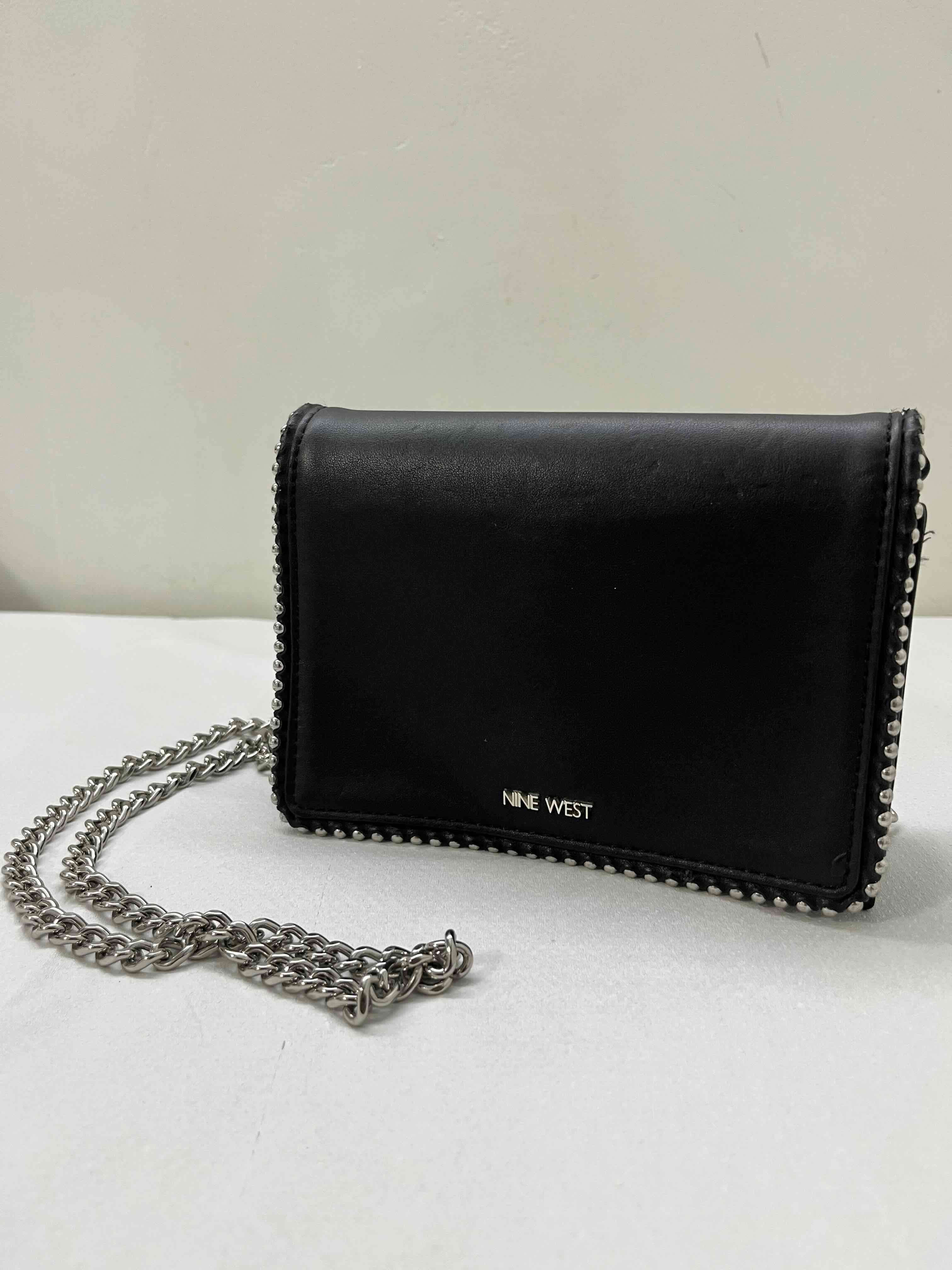 Elegante cartera negra con cadena metálica. Ideal para eventos formales.