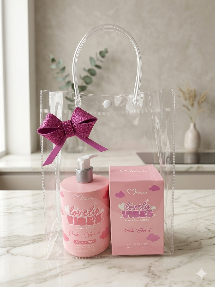 Set de regalo 'Lovely Vibes' con perfume y loción corporal. Ideal para un aroma suave y dulce. Nuevo en bolsa transparente.