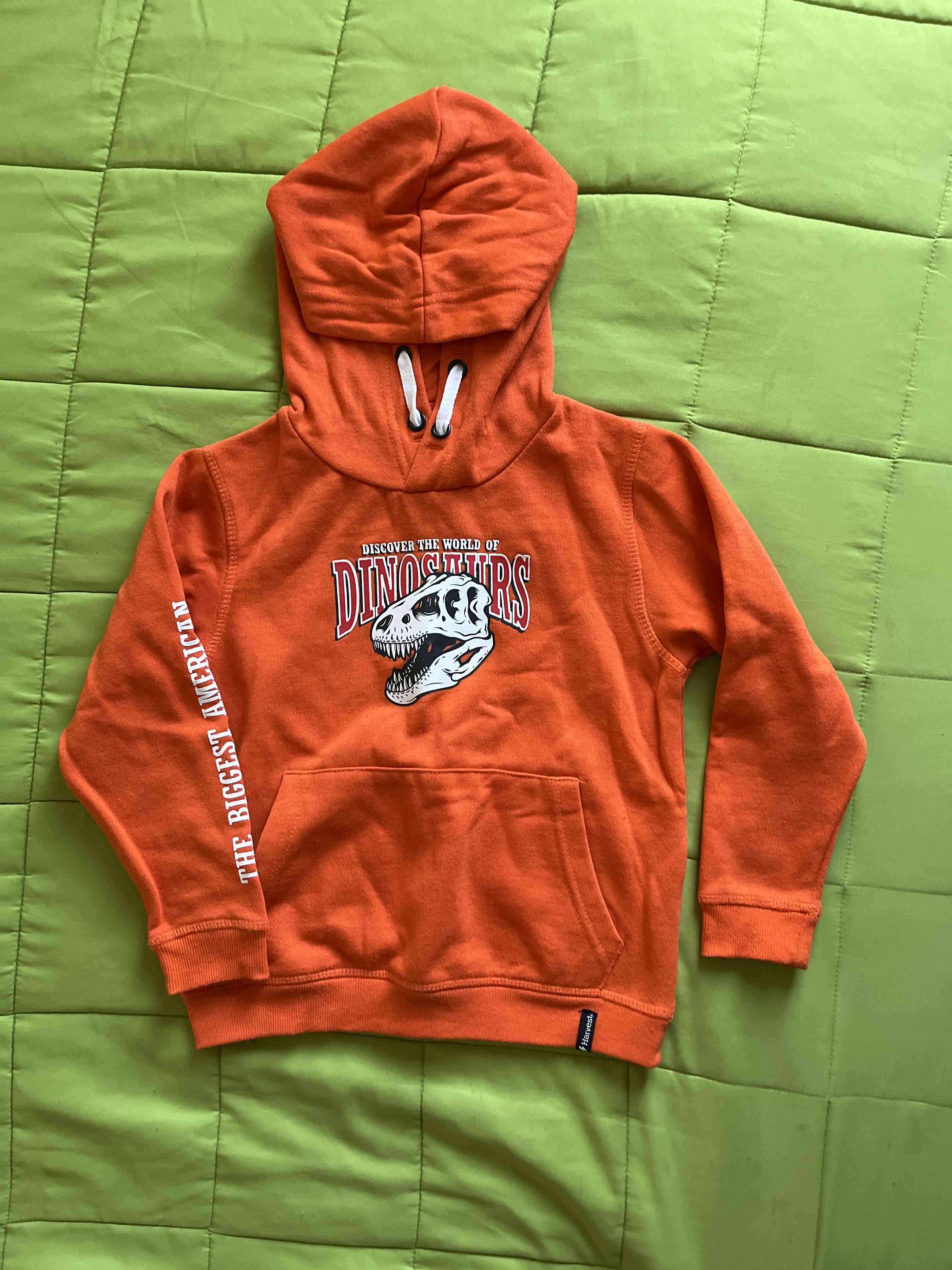 Polerón naranja con diseño de dinosaurios, ideal para niños aventureros. Buen estado poco uso, cómodo y abrigador, talla 6