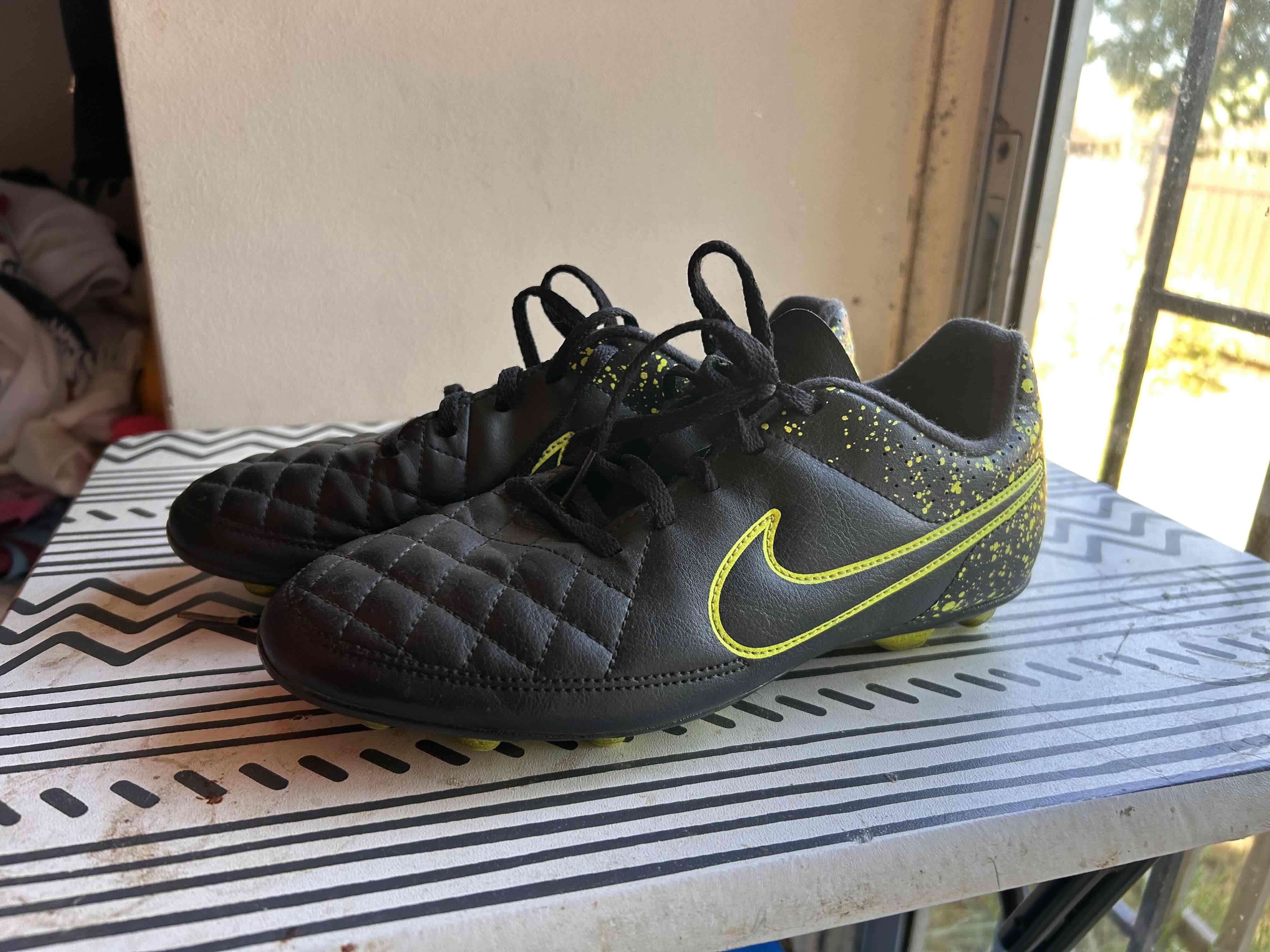 Zapatos de fútbol negro con detalles en amarillo. Buen estado, perfectos para cancha de pasto. Talla cómoda y resistente para partidos intensos.