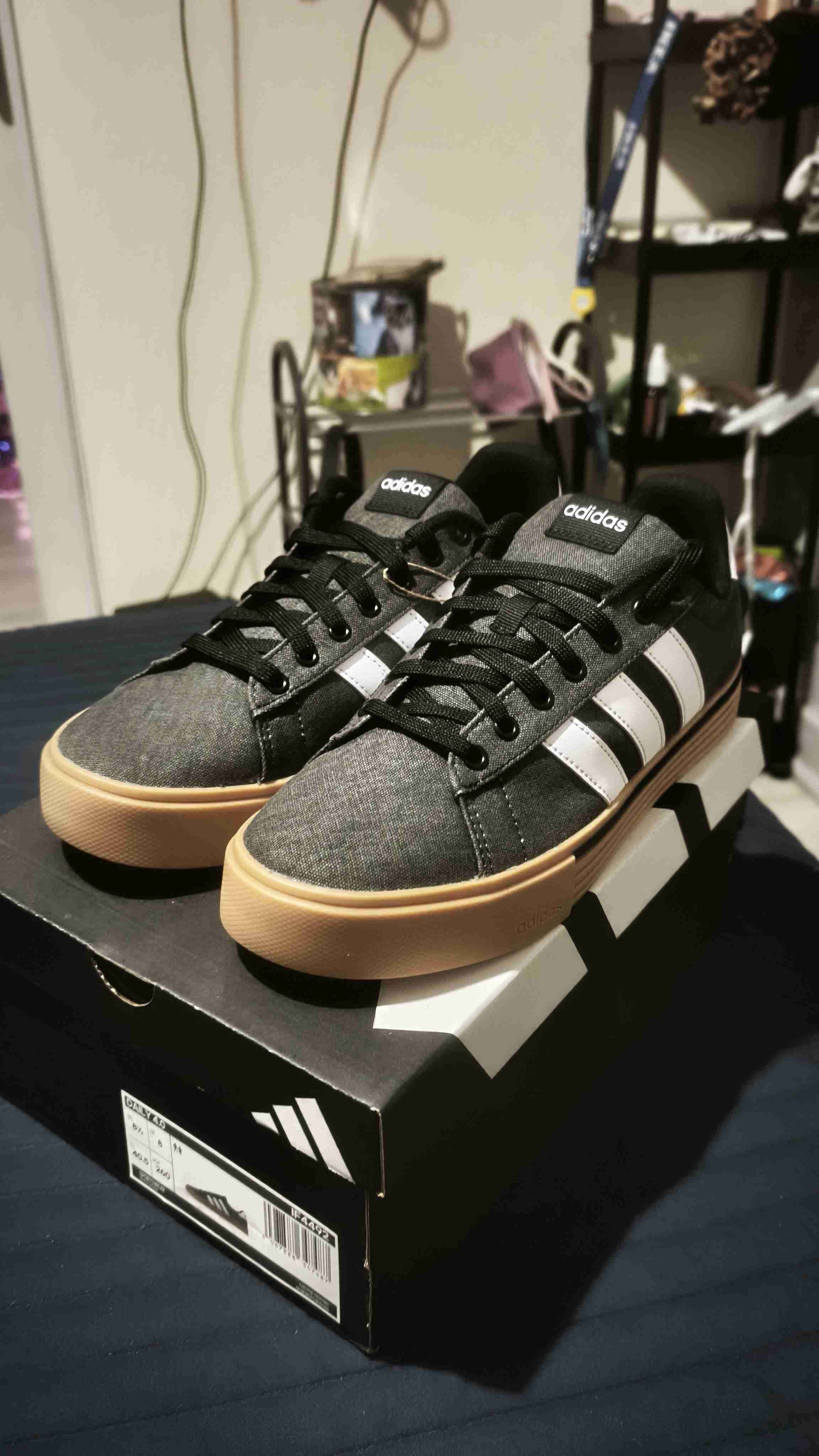 Zapatillas Adidas negras con suela de goma clara, en excelente estado y estilo urbano. Perfectas para uso diario.