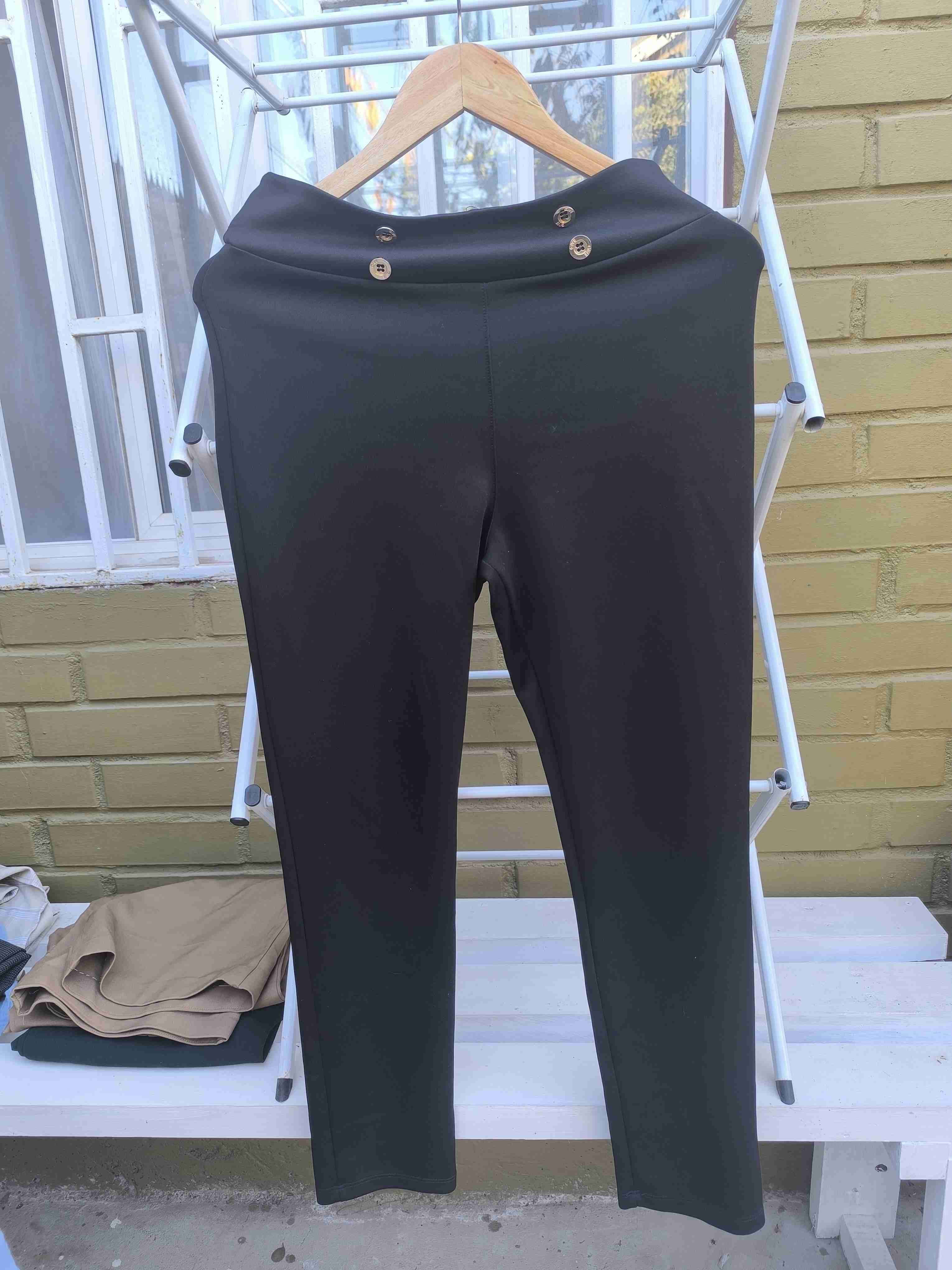 Pantalón negro elegante con detalle de botones dorados para un look formal. En buen estado y cómodo para usar a diario.