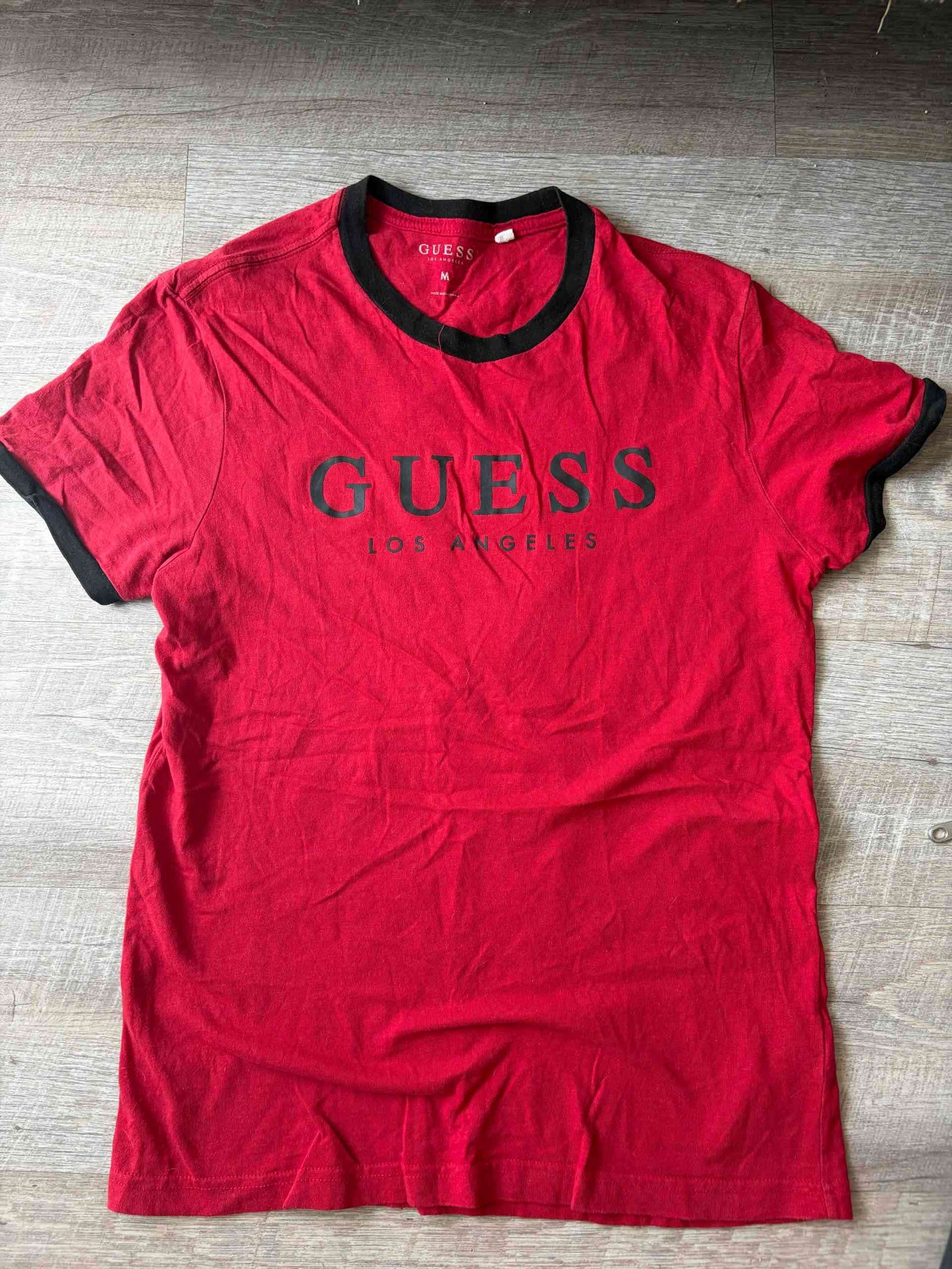Polera en tono rojo con detalles negros y logo Guess en el frente. Ideal para un look casual.