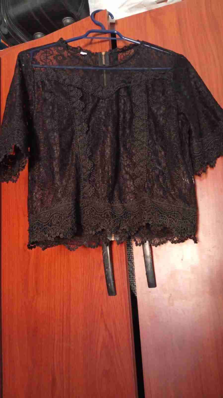 Blusa elegante de encaje negro, ideal para ocasiones formales. En buen estado, con cierre en la espalda.