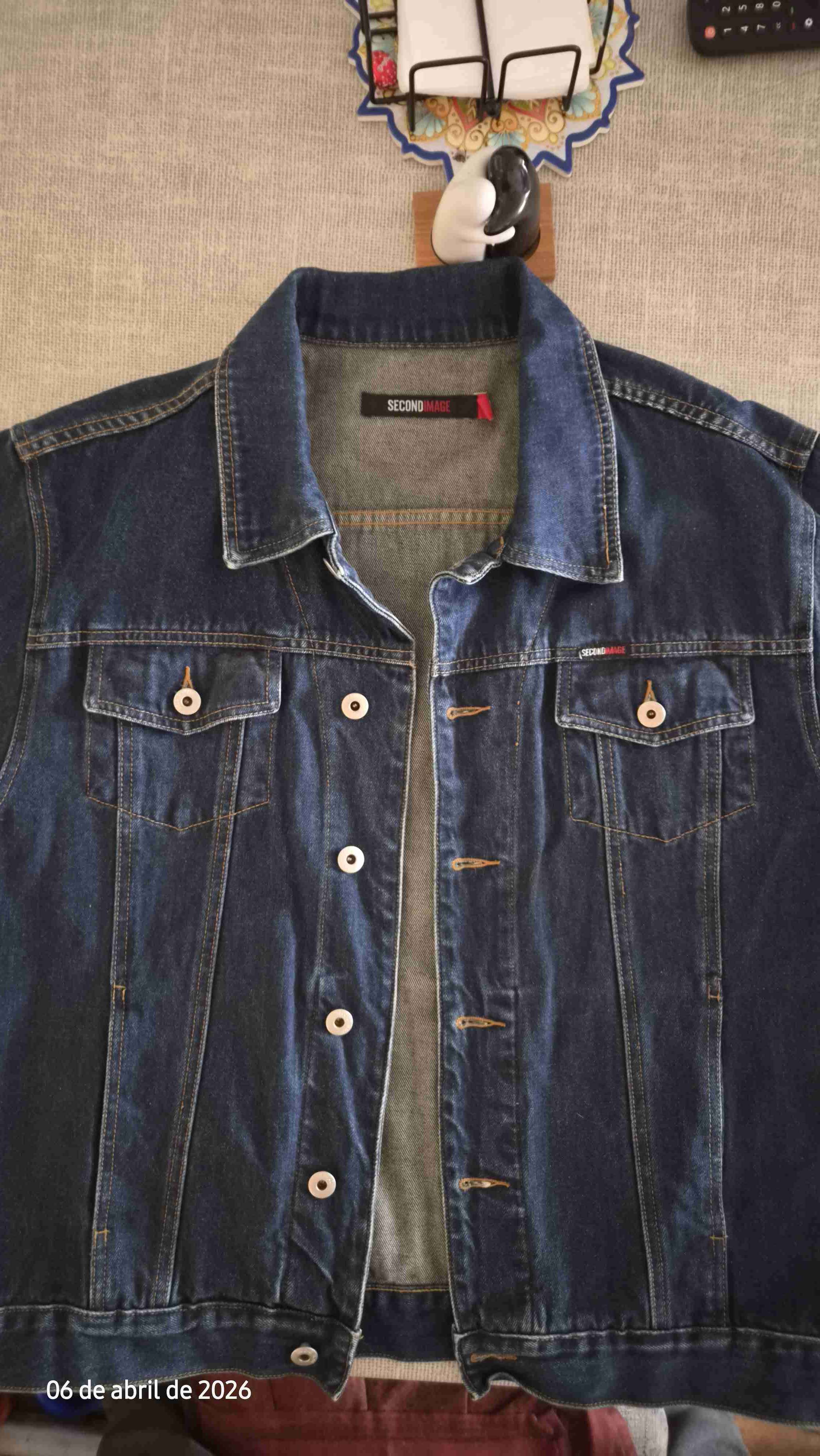 Chaqueta de mezclilla azul oscuro, ideal para el día a día. Buen estado general, con mínimos signos de uso.