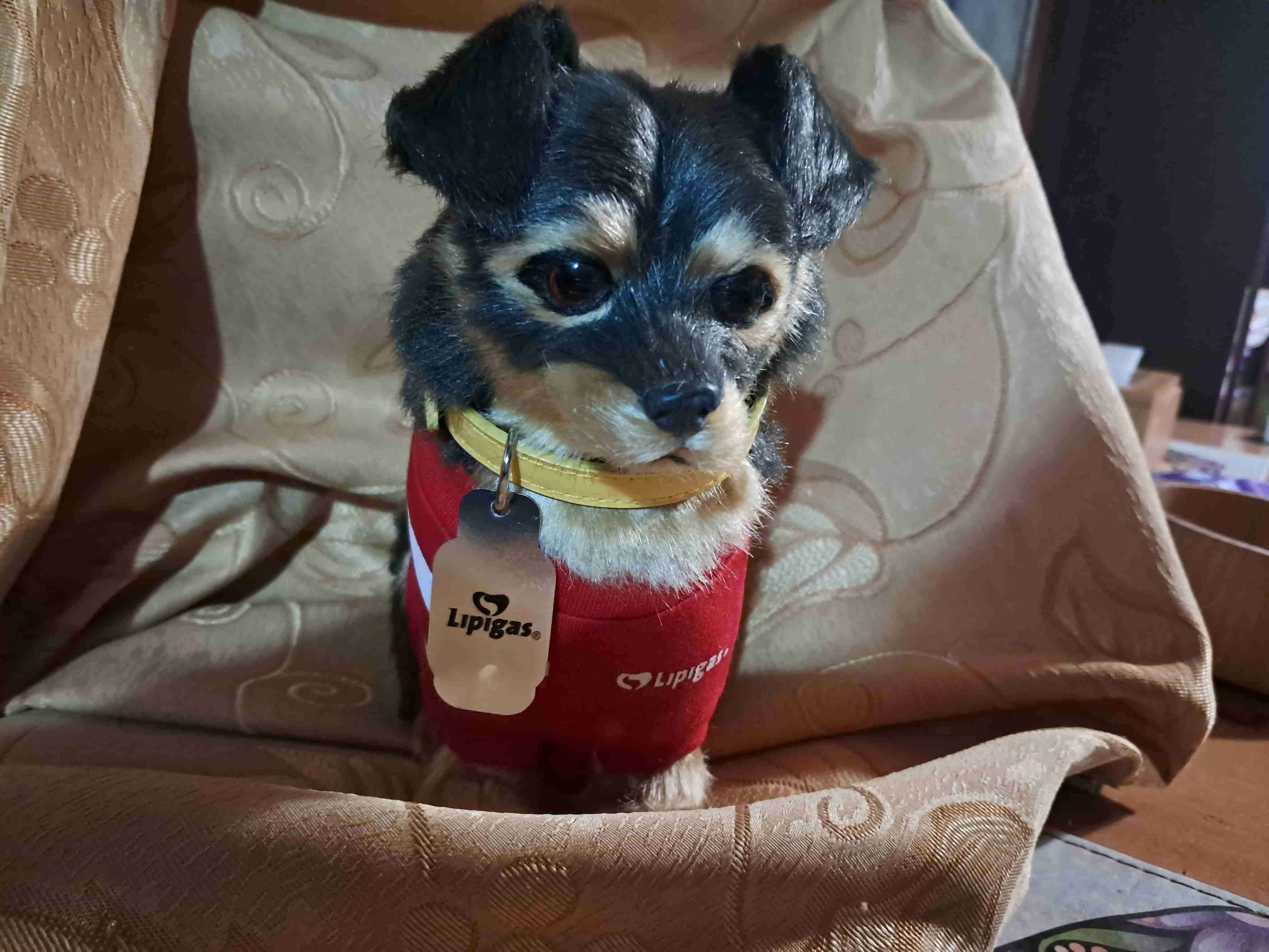 Peluche en forma de perro con camiseta de Lipigas, ideal para decoración. Buen estado general.