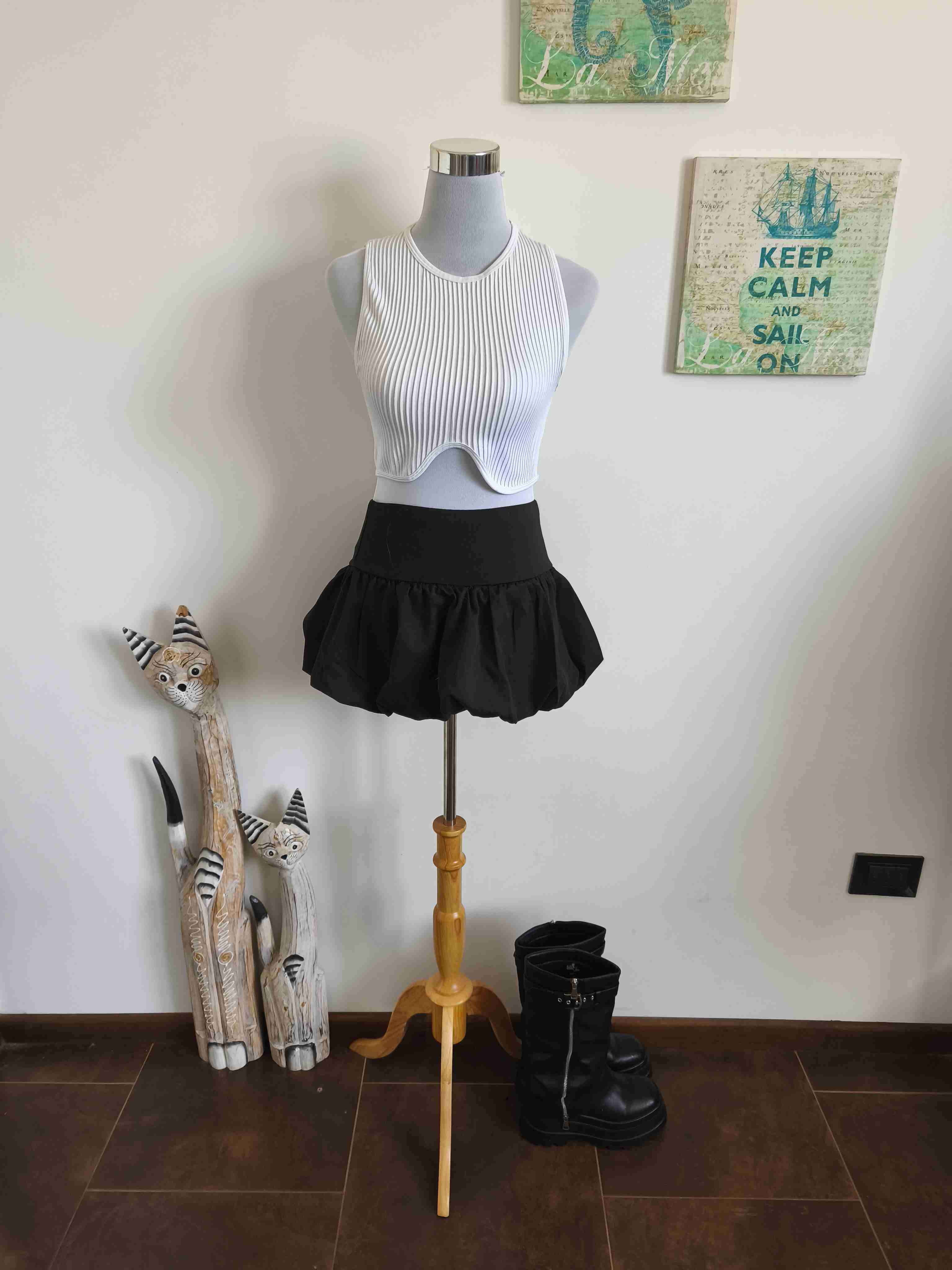 Estiloso conjunto de top blanco acanalado y falda negra, ideal para salidas casuales. Top $3.000 Falda $5.000
