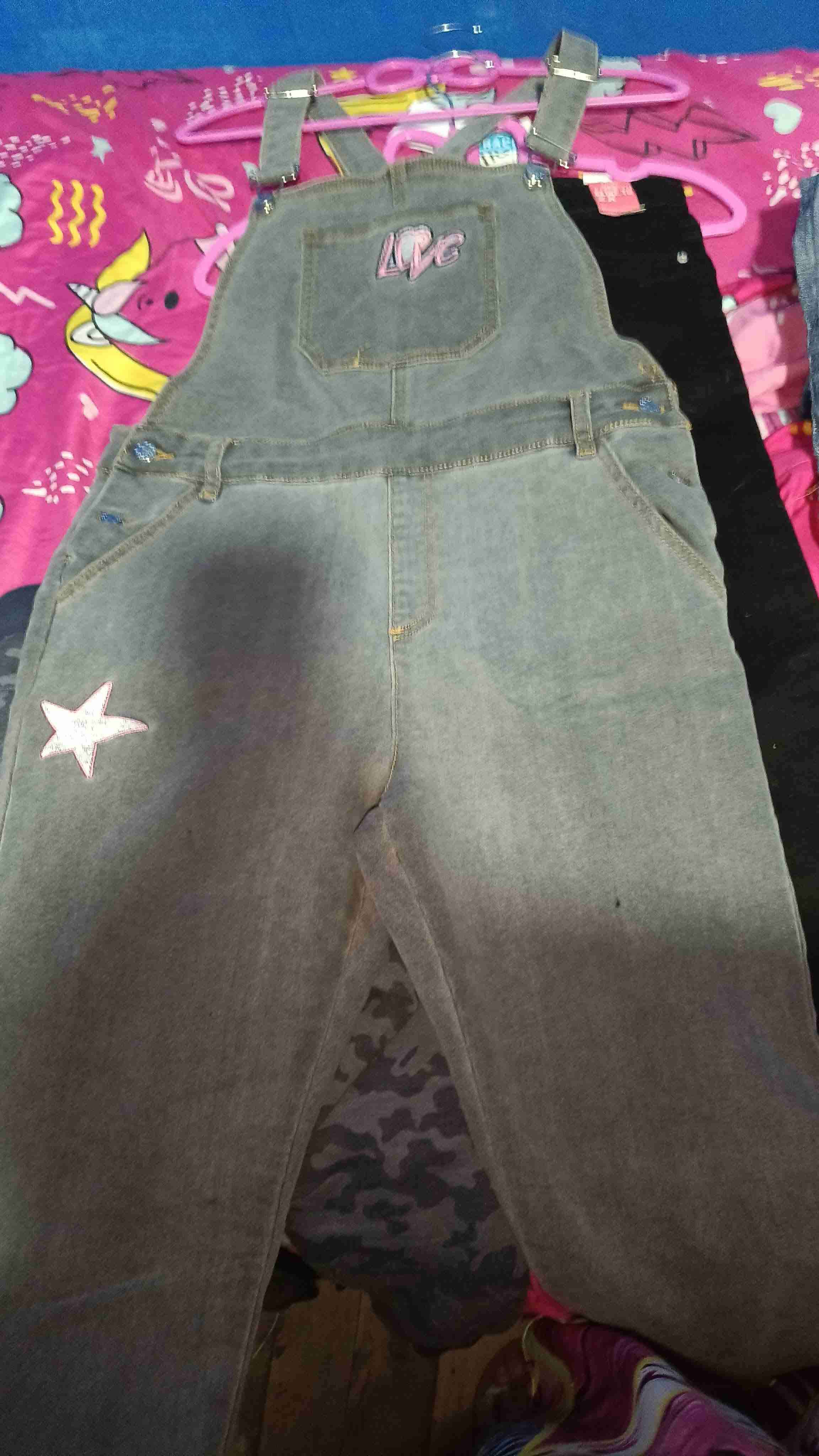 Jardinera de mezclilla elasticada gris con diseño bordado de 'LOVE' y estrella. En buen estado, ideal para un look casual. Talla 14.