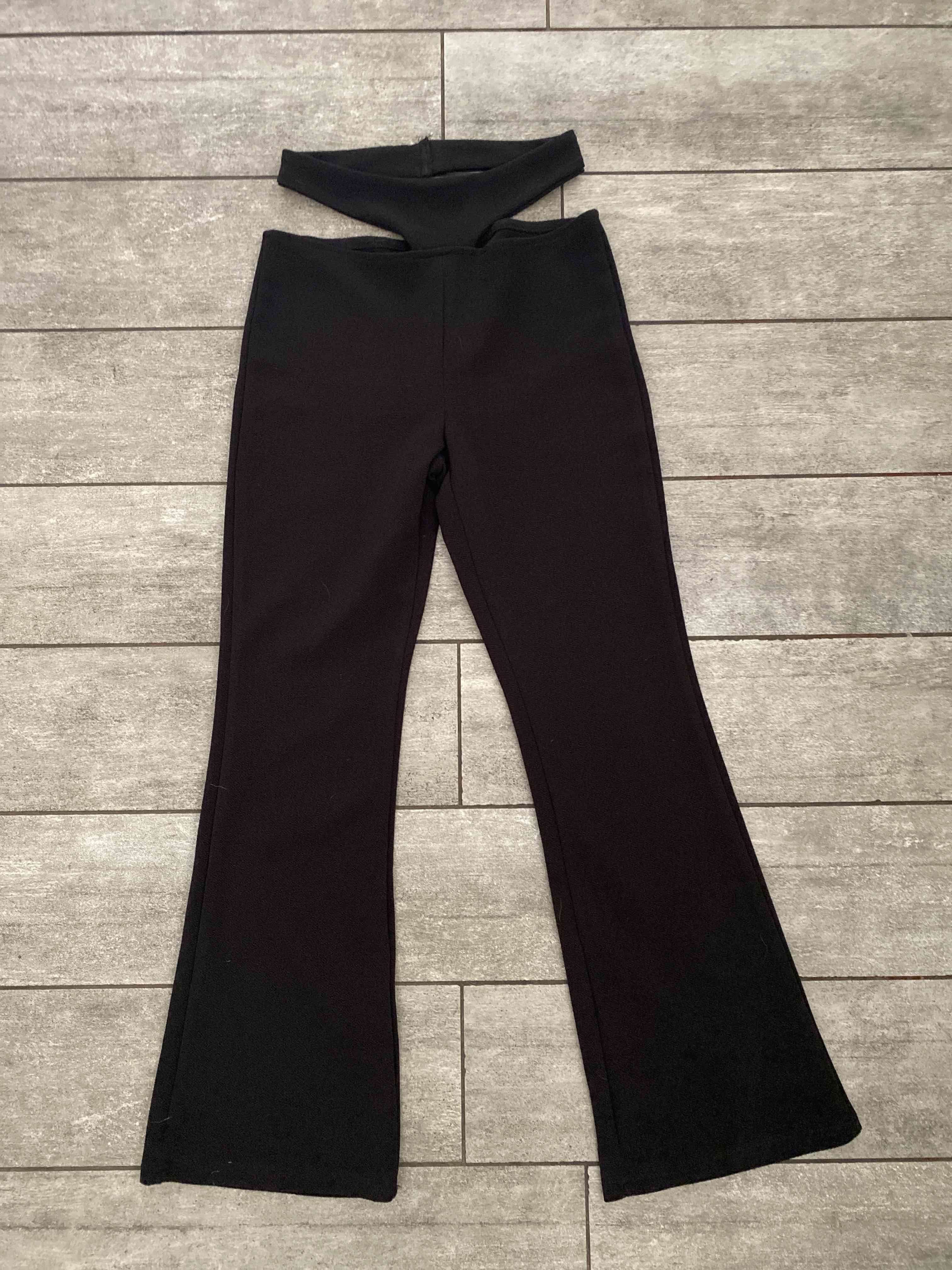 Pantalones negros con diseño acampanado, elasticado a con corte en las caderas, talla XS. Casi sin uso