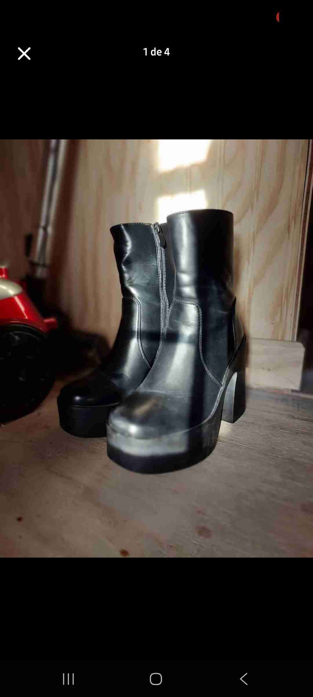 Botines negros de cuero sintético, con suela gruesa y cierre al costado, nuevos.