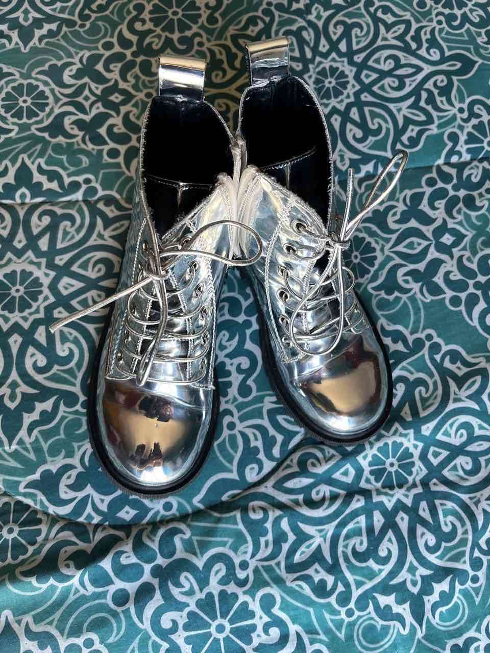 Botines de estilo moderno en plateado brillante, perfectos para destacar. En buen estado general con leves signos de uso. Talla 29