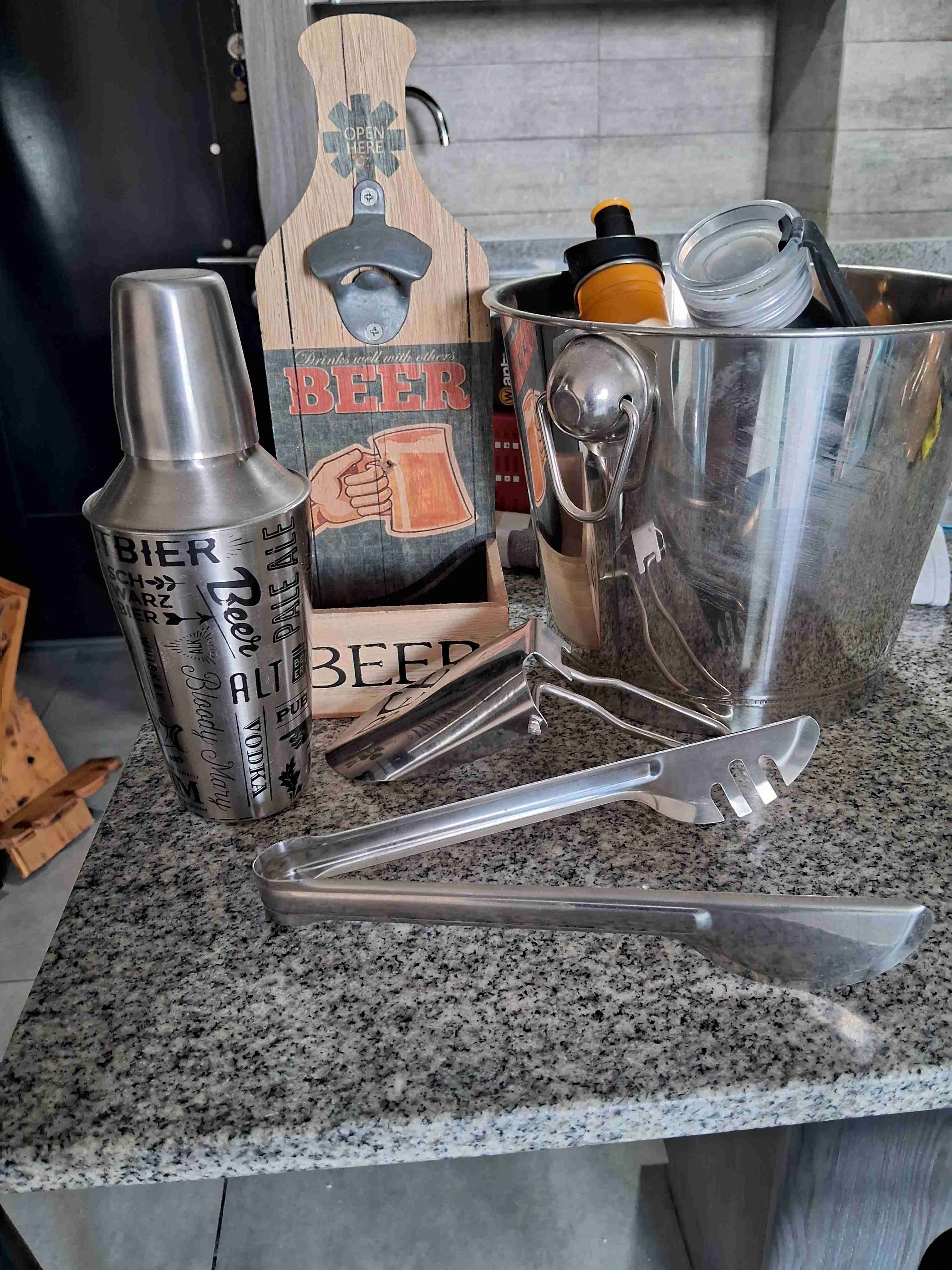 Set de bar completo con cubeta metálica, destapador de pared y coctelera. Ideal para tus reuniones en casa.