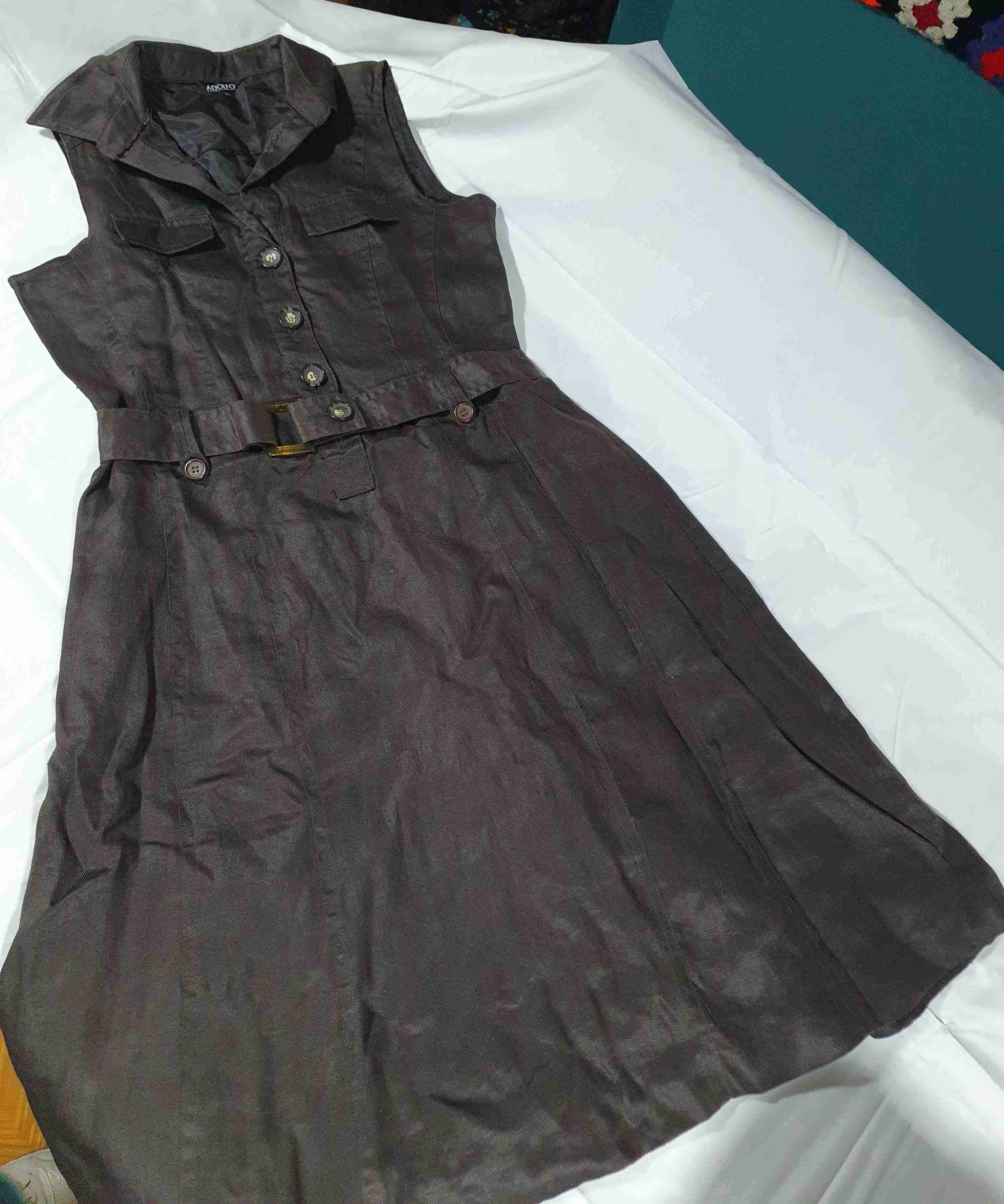 Elegante vestido marrón con cinturón, ideal para ocasiones formales. Buen estado general.