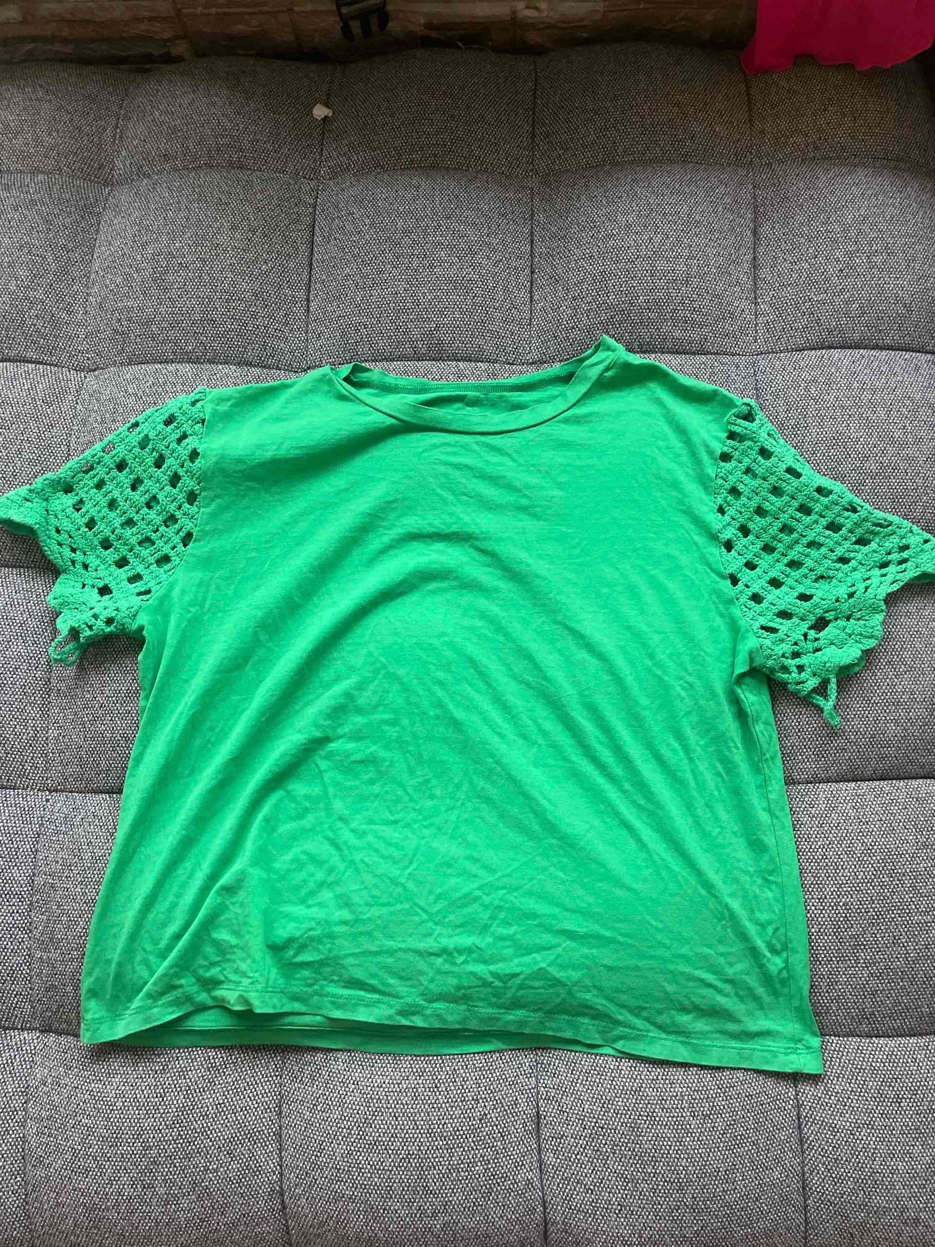 Polera verde lima con detalle calado en las mangas. En buen estado, ideal para uso casual. Nuevo y talla estándar.