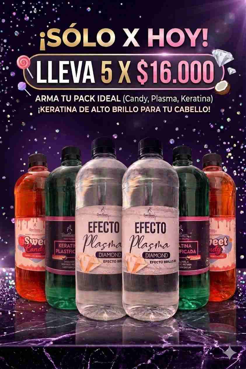 Pack de keratinas de alto brillo ideal para cabello. Incluye variedades Candy, Plasma y Keratina. Oferta limitada.