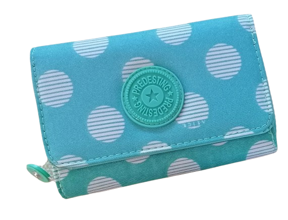 Billetera en color turquesa con diseño de lunares blancos, ideal para uso diario. En excelente estado, Nueva.