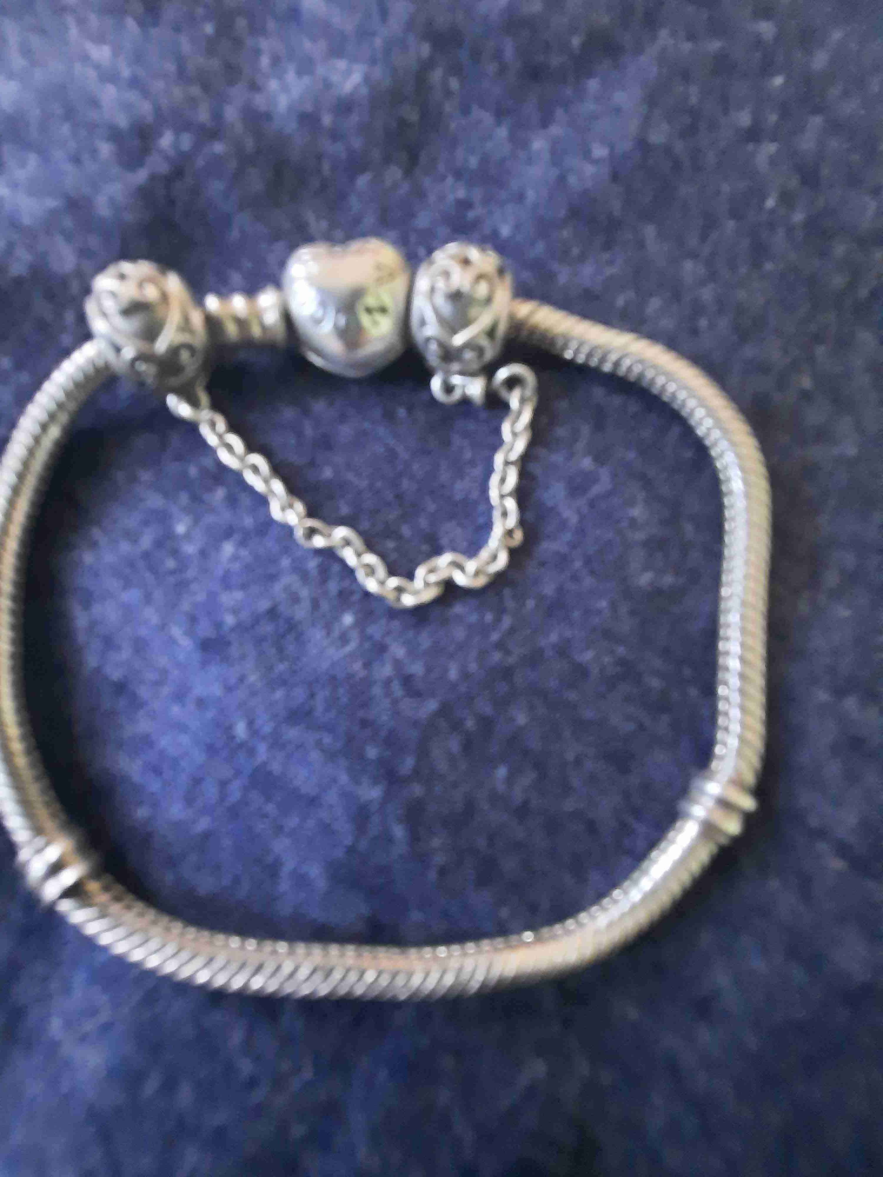 Elegante pulsera de plata con detalles en dijes de corazón. En buen estado para uso diario,.marca Pandora original, con seguridad.