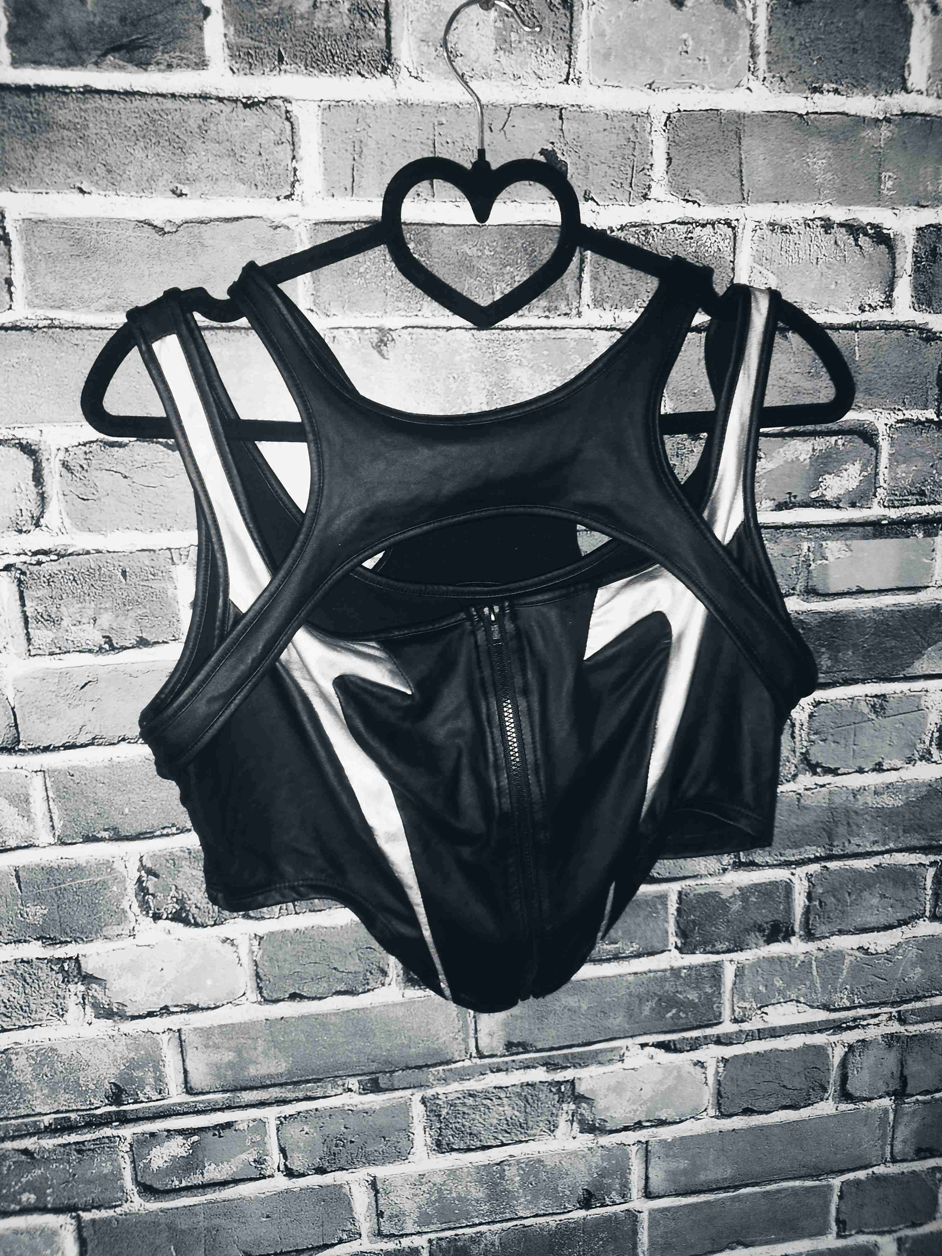 Top deportivo sin mangas, ideal para ejercicios. Se ve en buen estado, con cierre frontal.