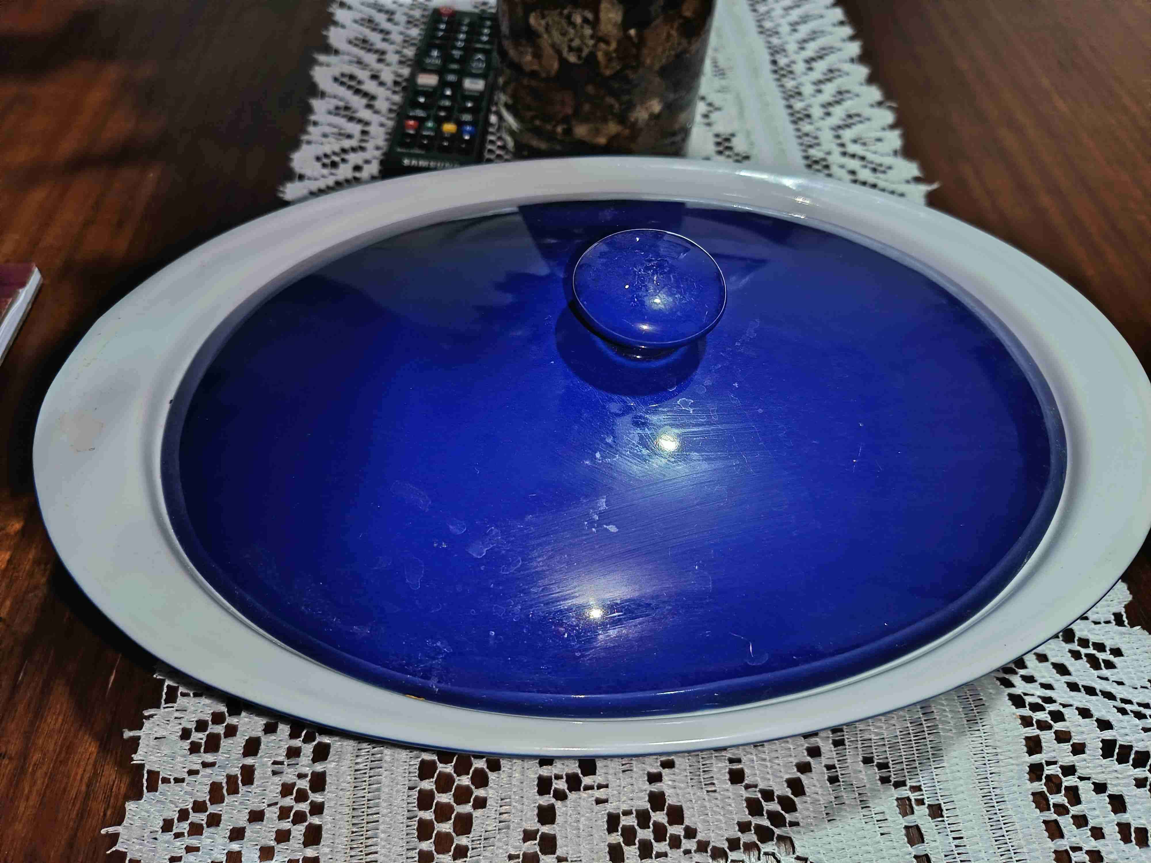 Fuente de porcelana con tapa azul