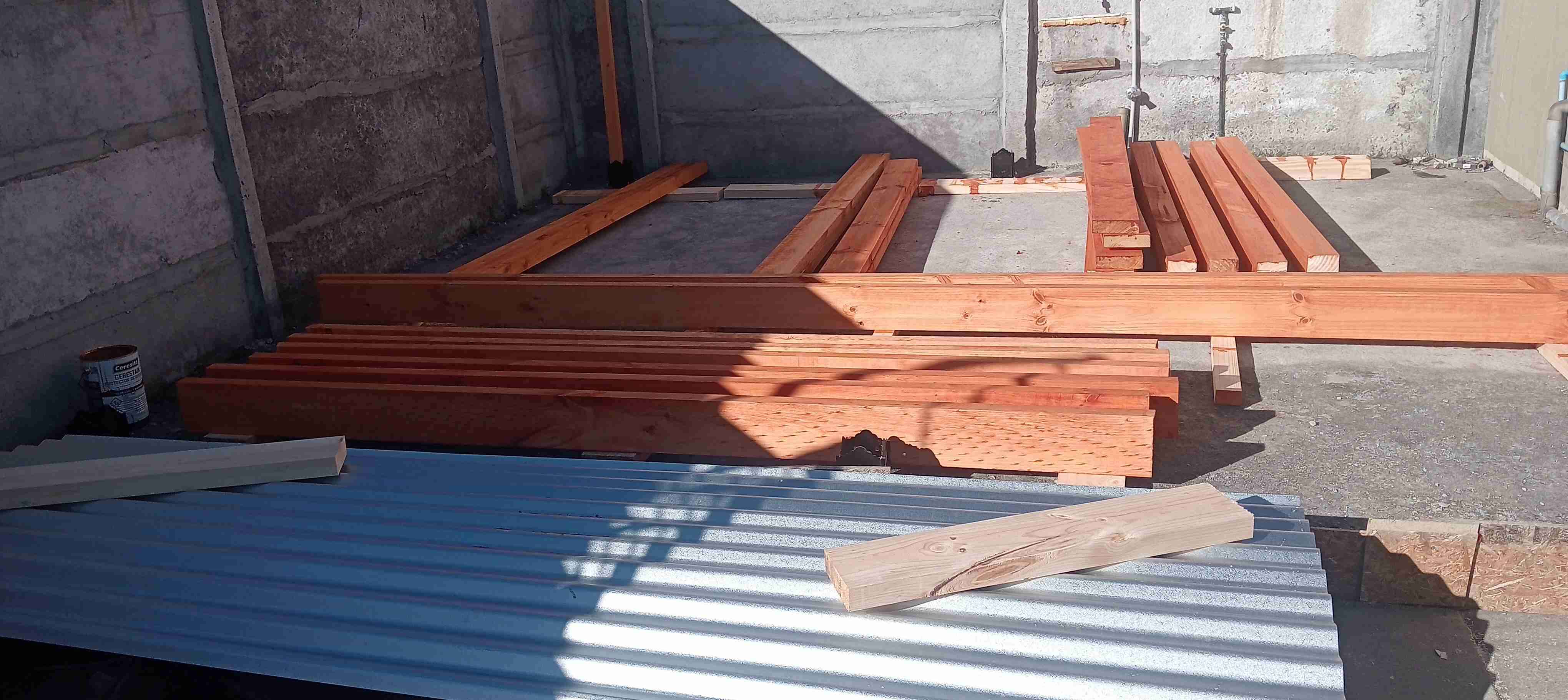 Conjunto de madera y planchas de zinc para proyectos de construcción. Ideal para crear estructuras o ampliaciones. Buen estado general.