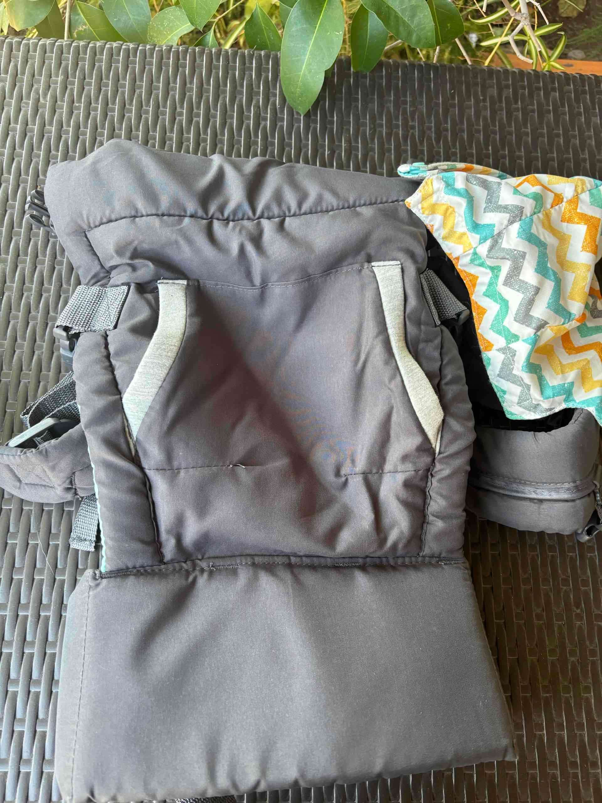 Mochila porta bebé en buen estado, color gris. Ideal para paseos cómodos y seguros.