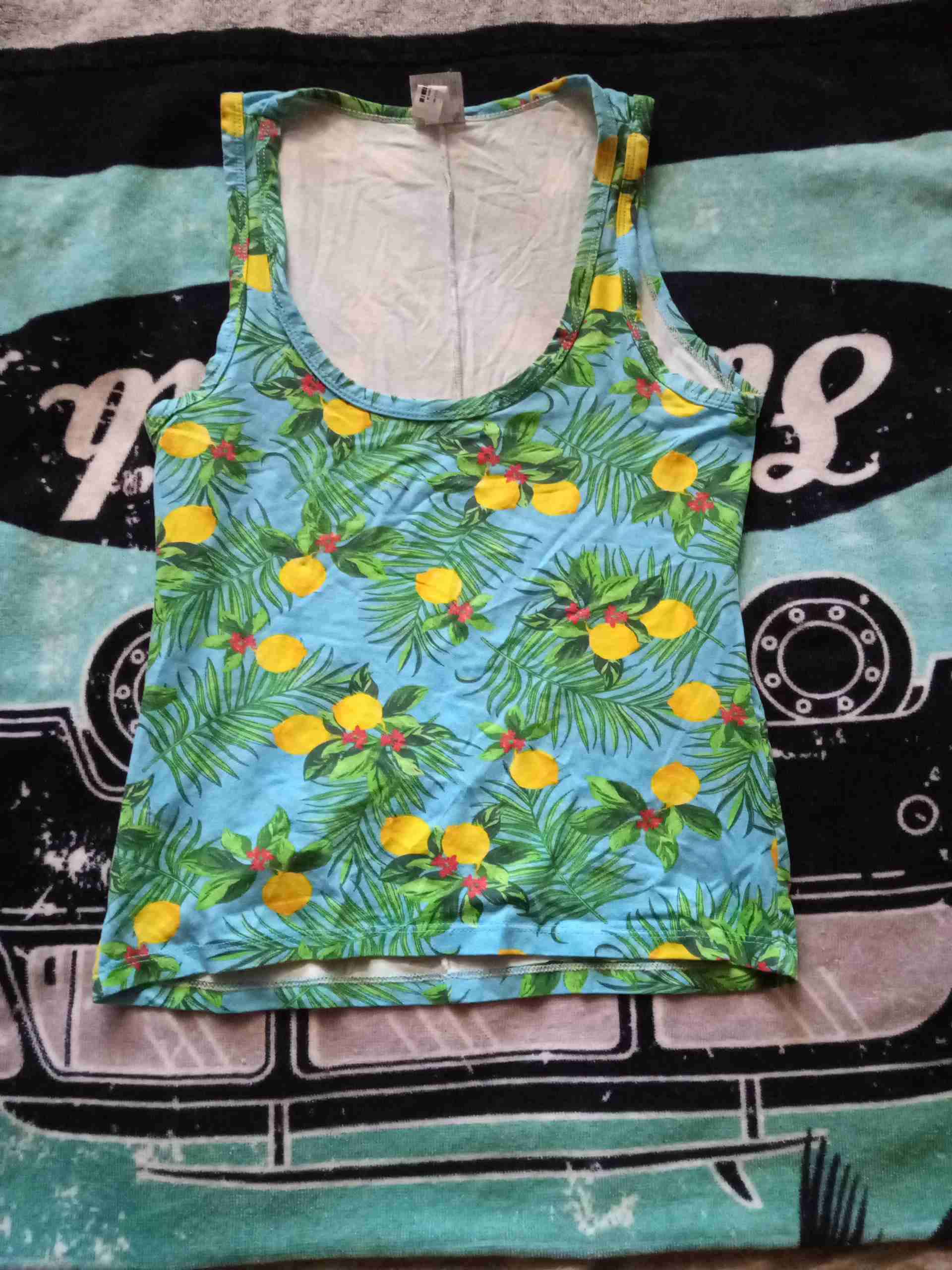 Colorida polera sin mangas con estampado de flores y limones, ideal para verano. En buen estado.