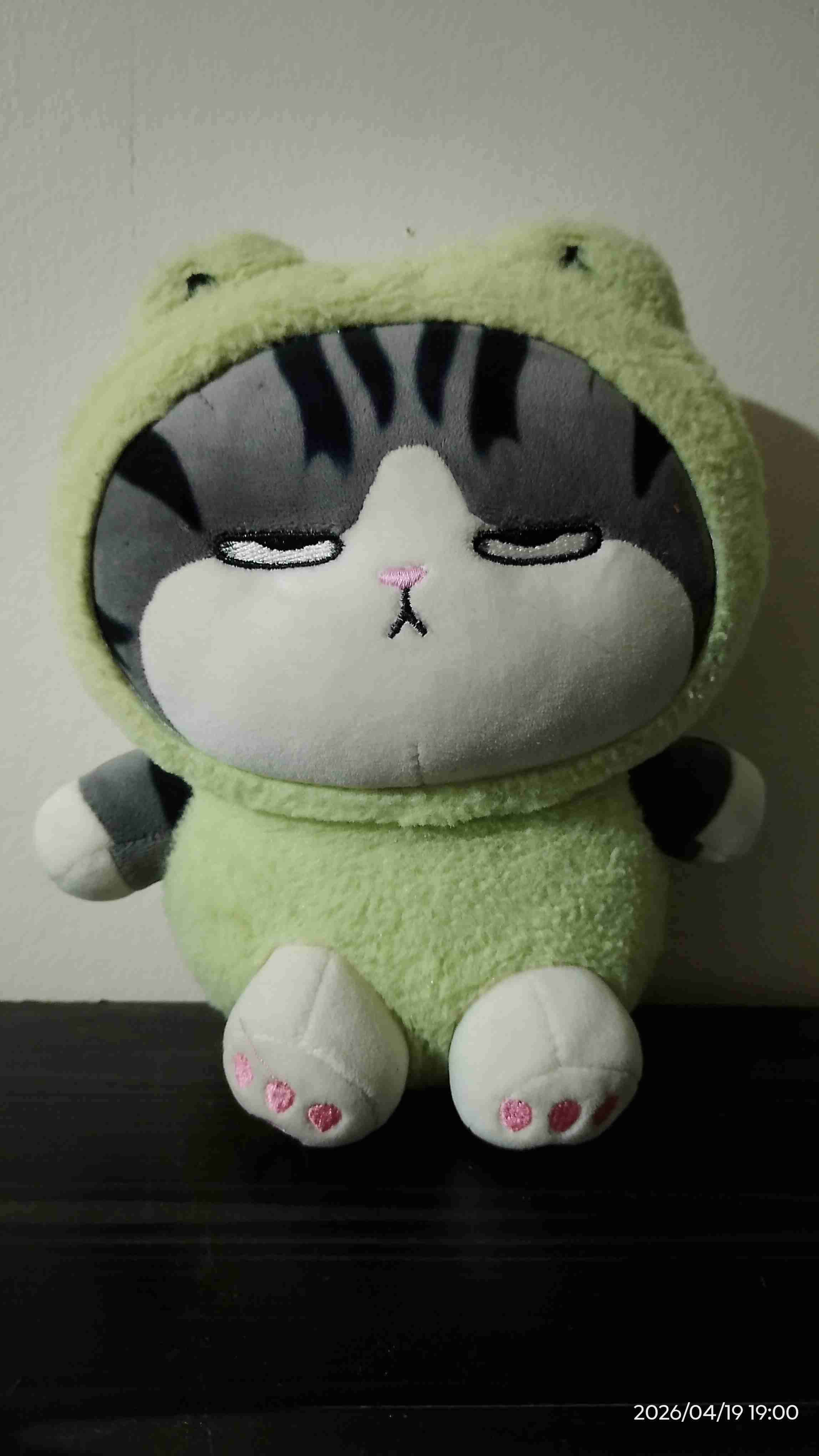 Peluche suave de gatito con disfraz de rana. Ideal para decorar y regalar. En buen estado.