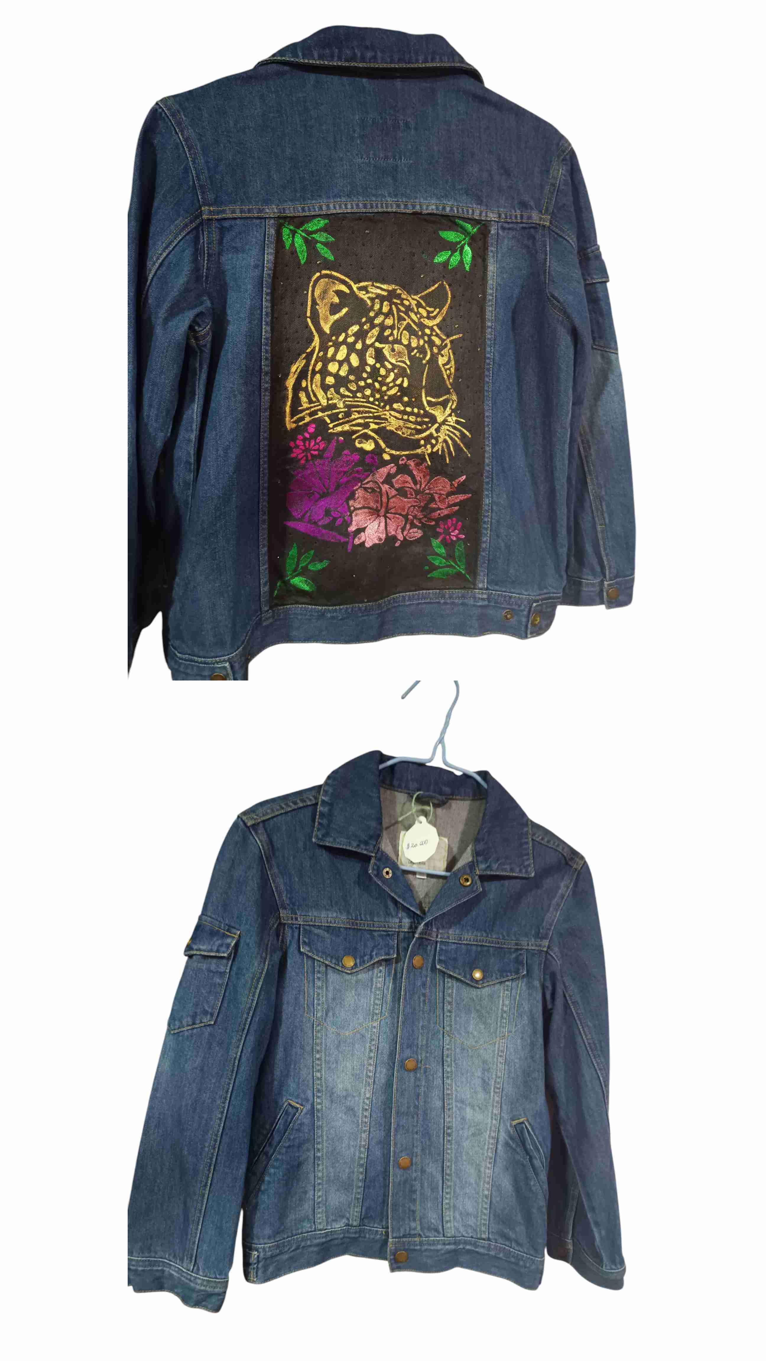 Chaqueta de mezclilla azul con diseño de leopardo. Perfecta para un estilo casual y único.