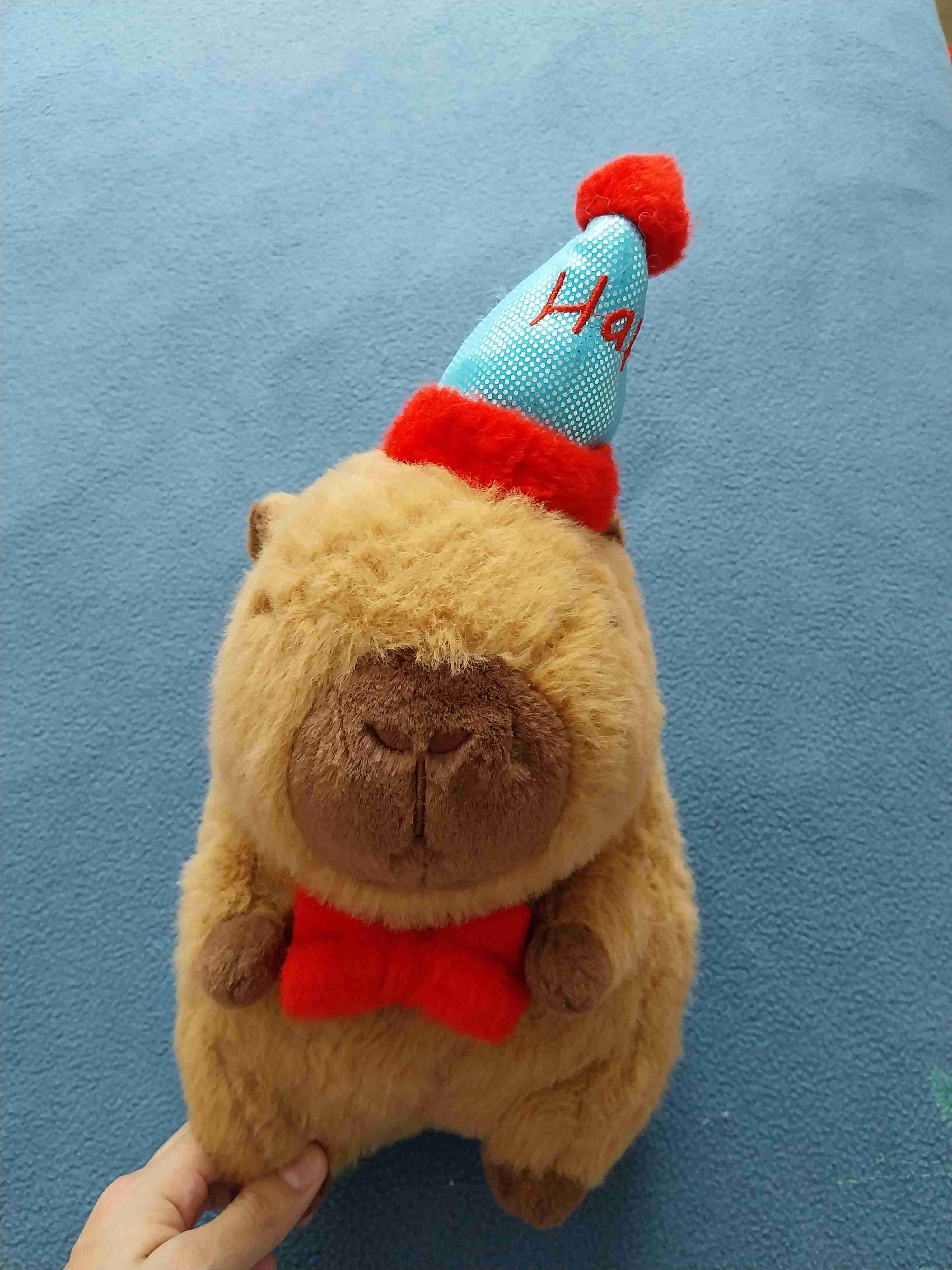 Peluche de capibara suave, ideal para regalo. Incluye un gorro de cumpleaños festivo.