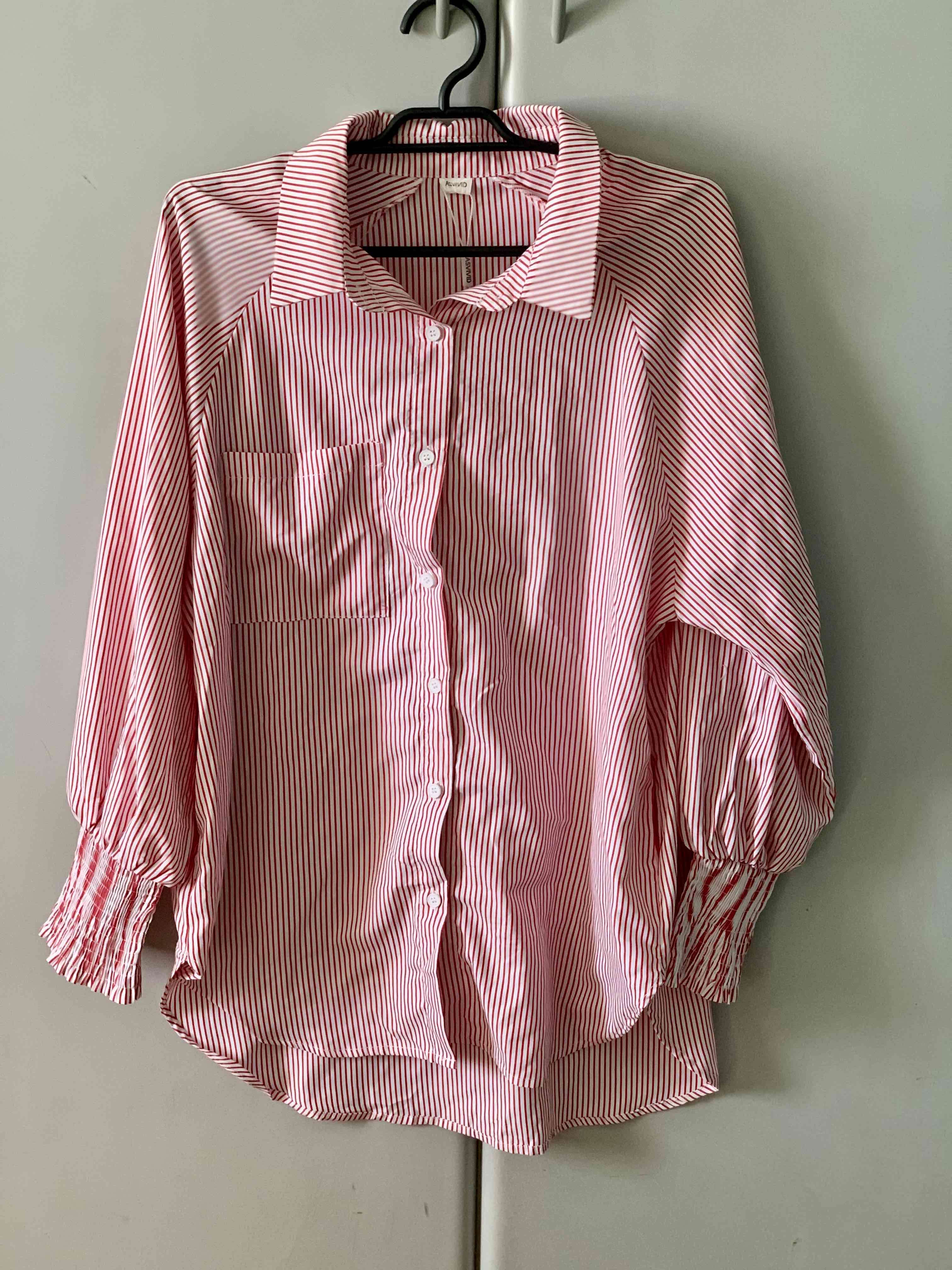 Camisa de rayas rosas y blancas, estilo casual y suelta. Ideal para el día a día.