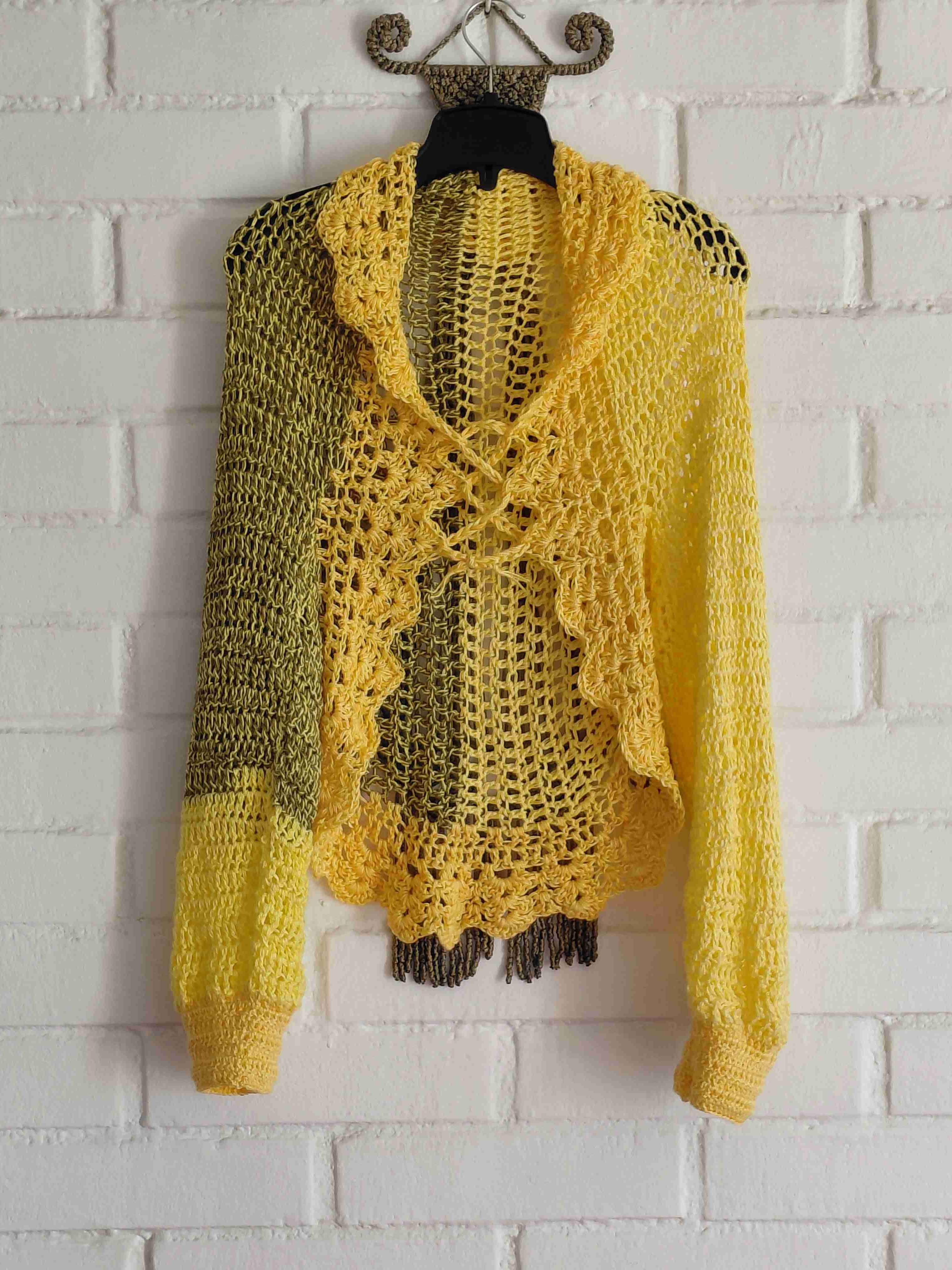 Cardigan tejido de estilo bohemio en tonos amarillos y verde olivo. Perfecto para días frescos. Tejido a crochet en hilo, salida de playa o paseos de tarde. Talla M/L