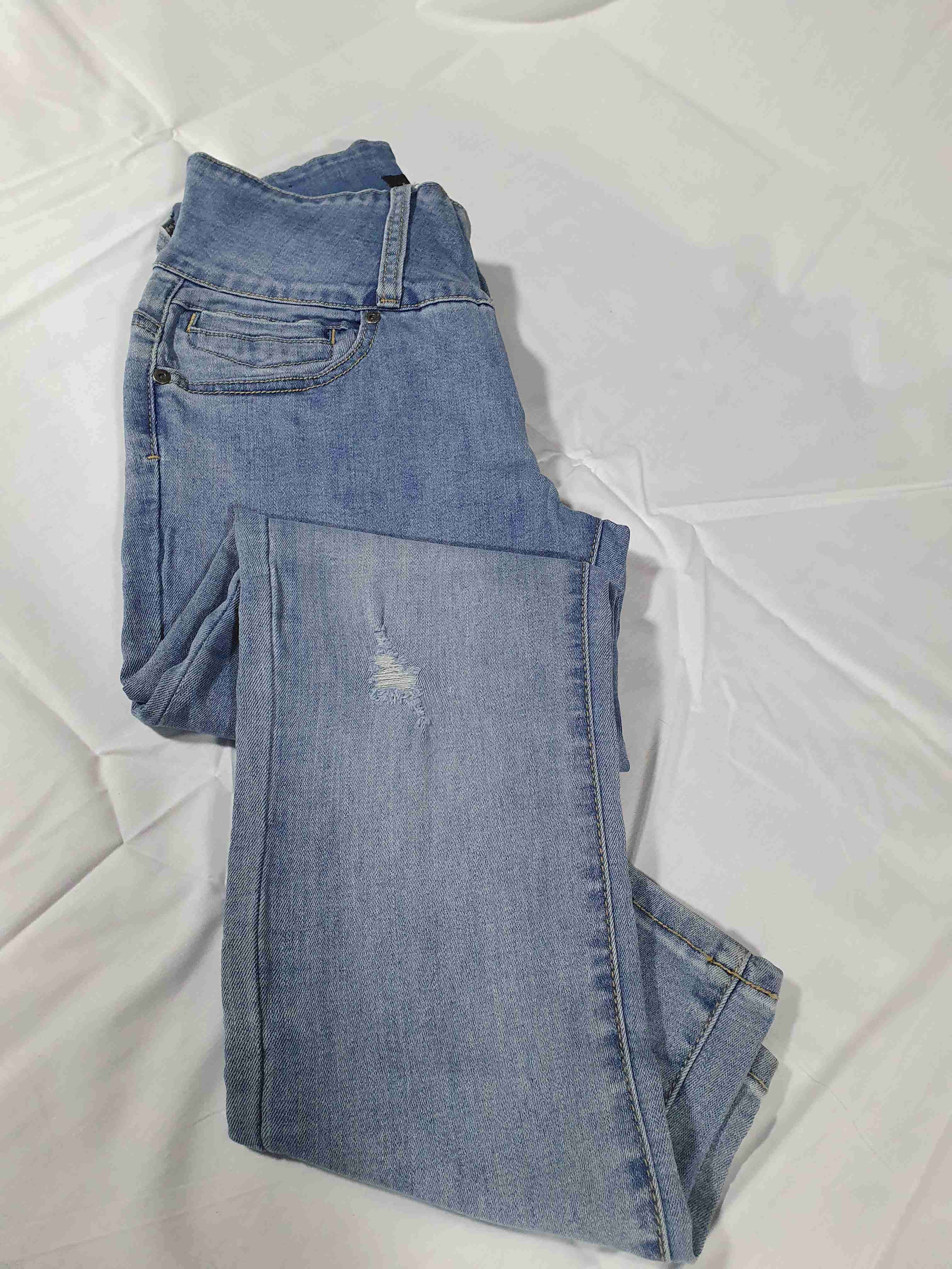 Jeans de mezclilla azul claro, estilo clásico con leves desgastes. Perfectos para un look relajado.