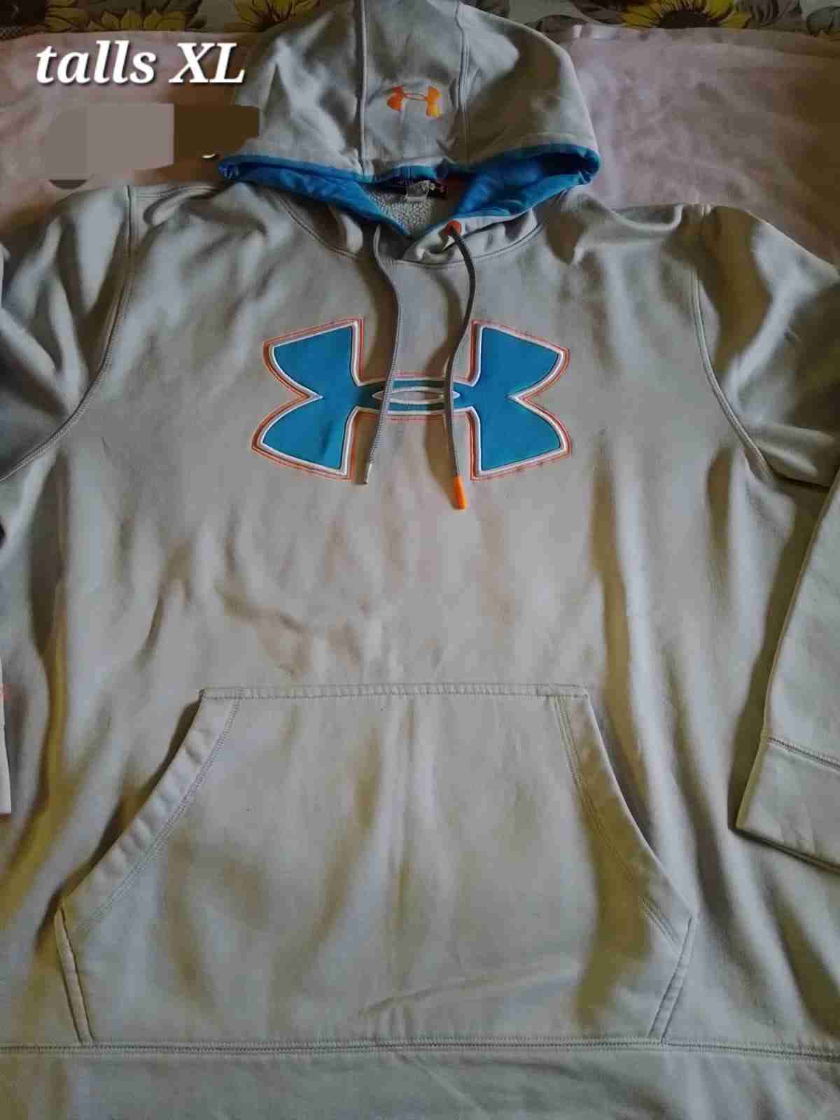Cómodo polerón gris con capucha, logo frontal azul. Ideal para días frescos. Estado general bueno.