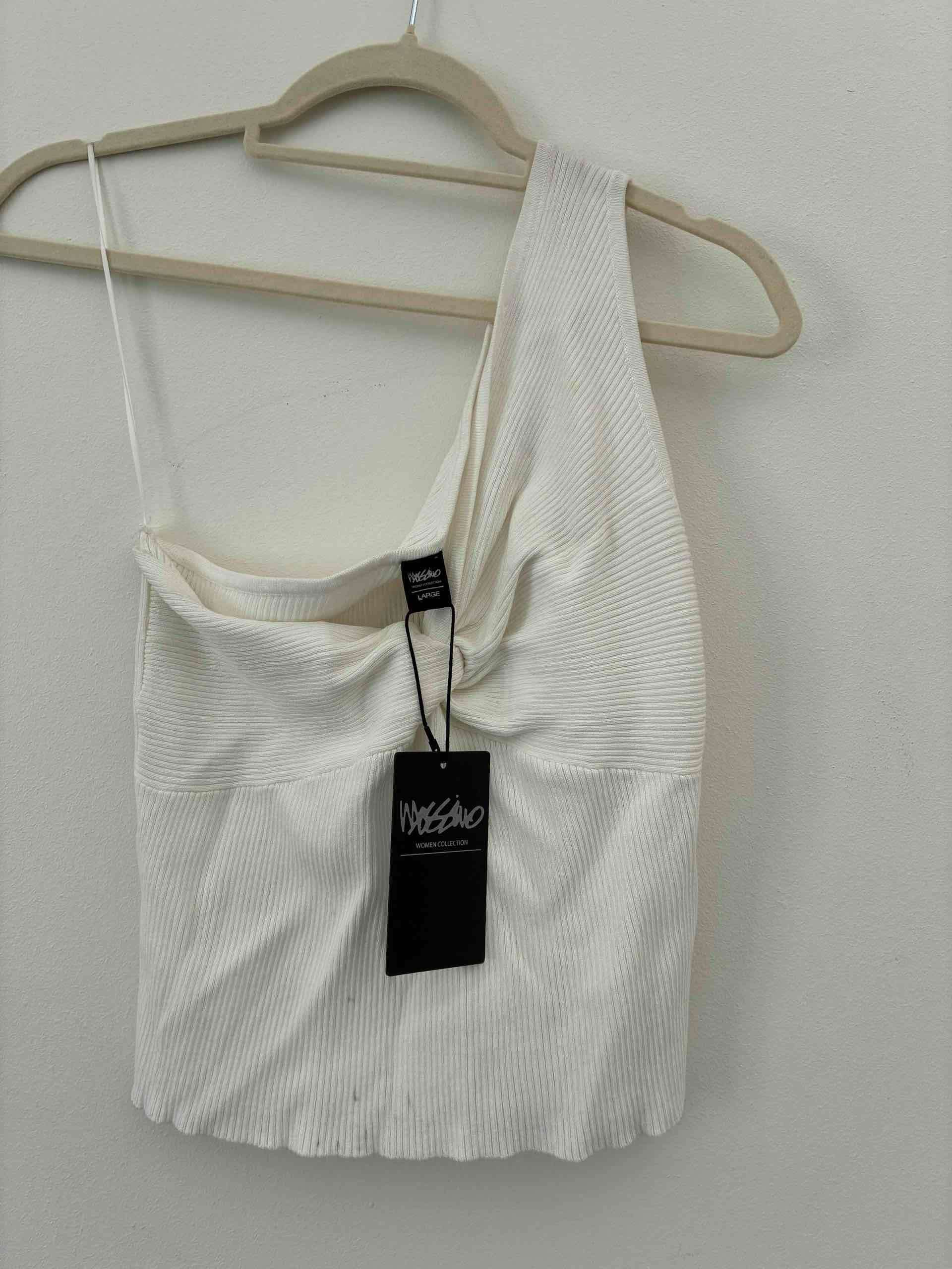 Top blanco de diseño asimétrico, en perfecto estado y con etiqueta. Ideal para ocasiones casuales o eventos formales.