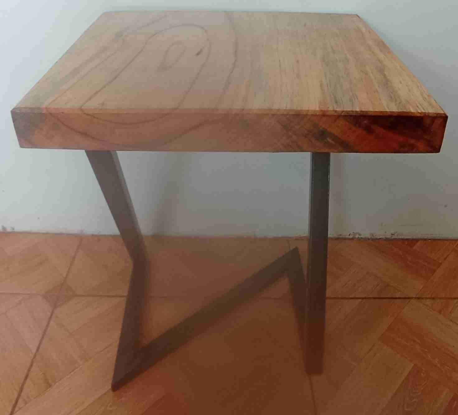 Mesa auxiliar de madera con barniz natural con diseño moderno y acaado patas de metal en negro.