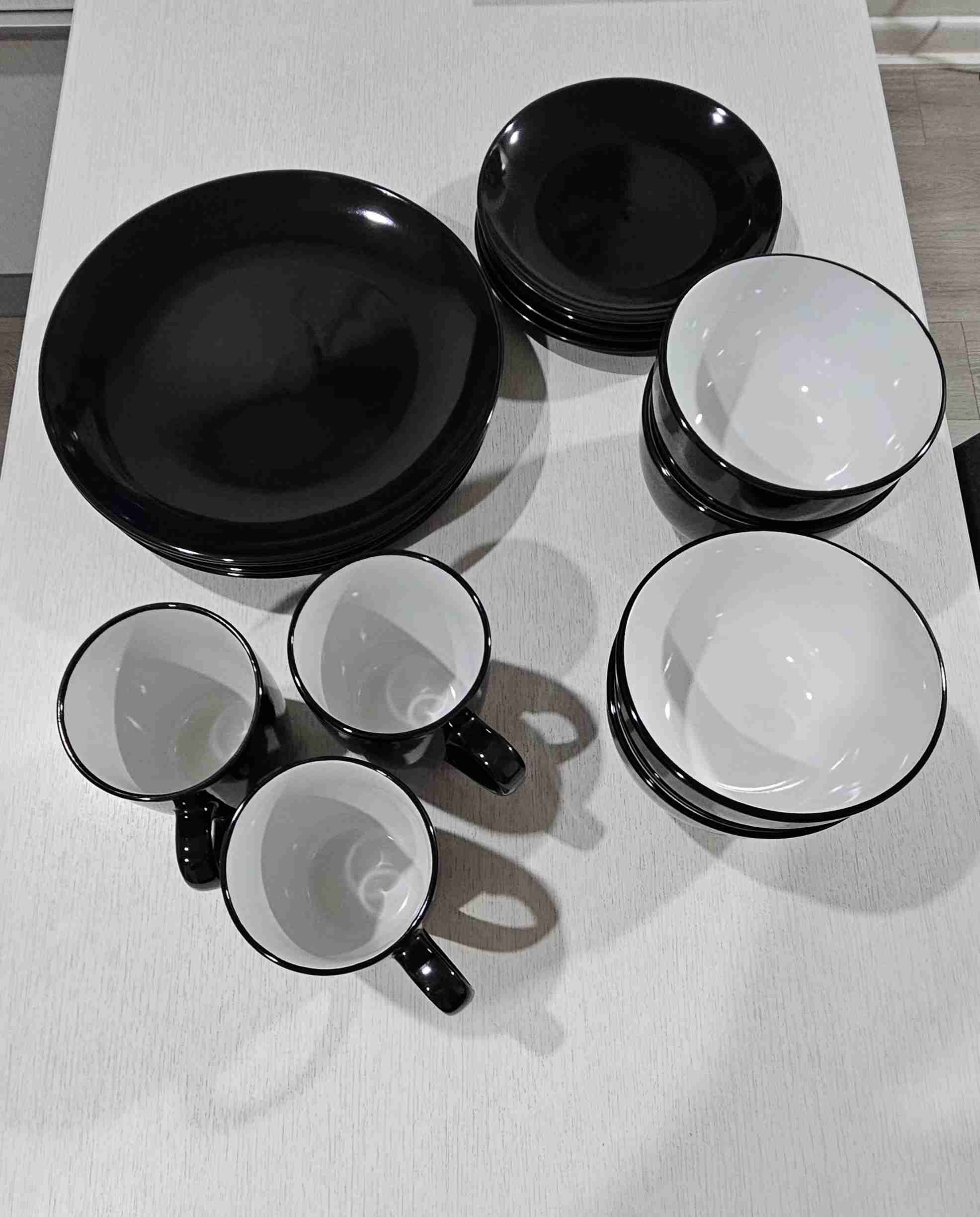 Elegante vajilla de color negro, ideal para cenas especiales. Incluye 4 platos grandes, 4 platos pequeños, 4 tazones y 3 tazas. En buen estado general.