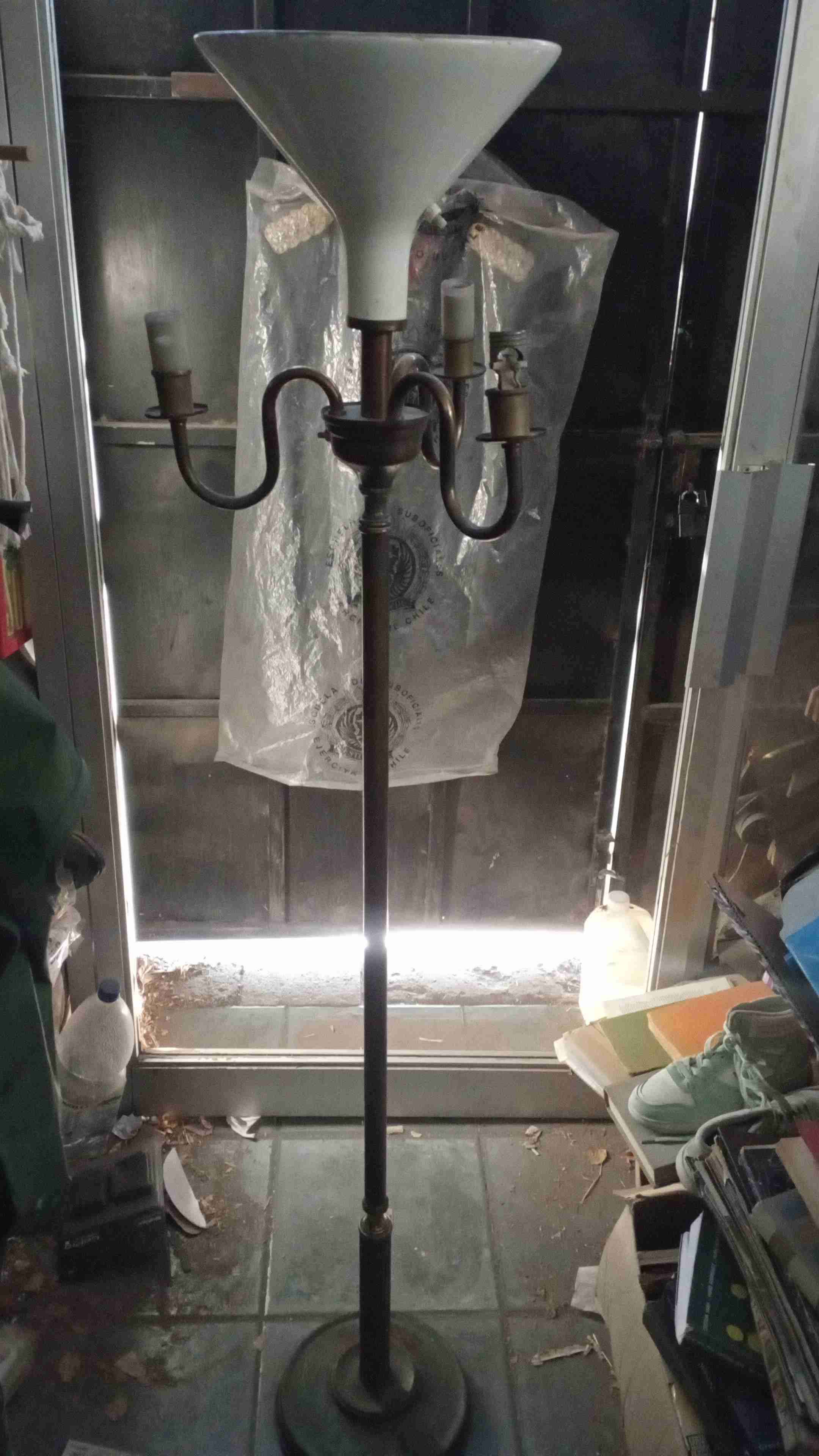 Elegante lámpara de pie estilo vintage en bronce, ideal para decoración clásica. Funciona correctamente, con pequeños signos de uso en la base.