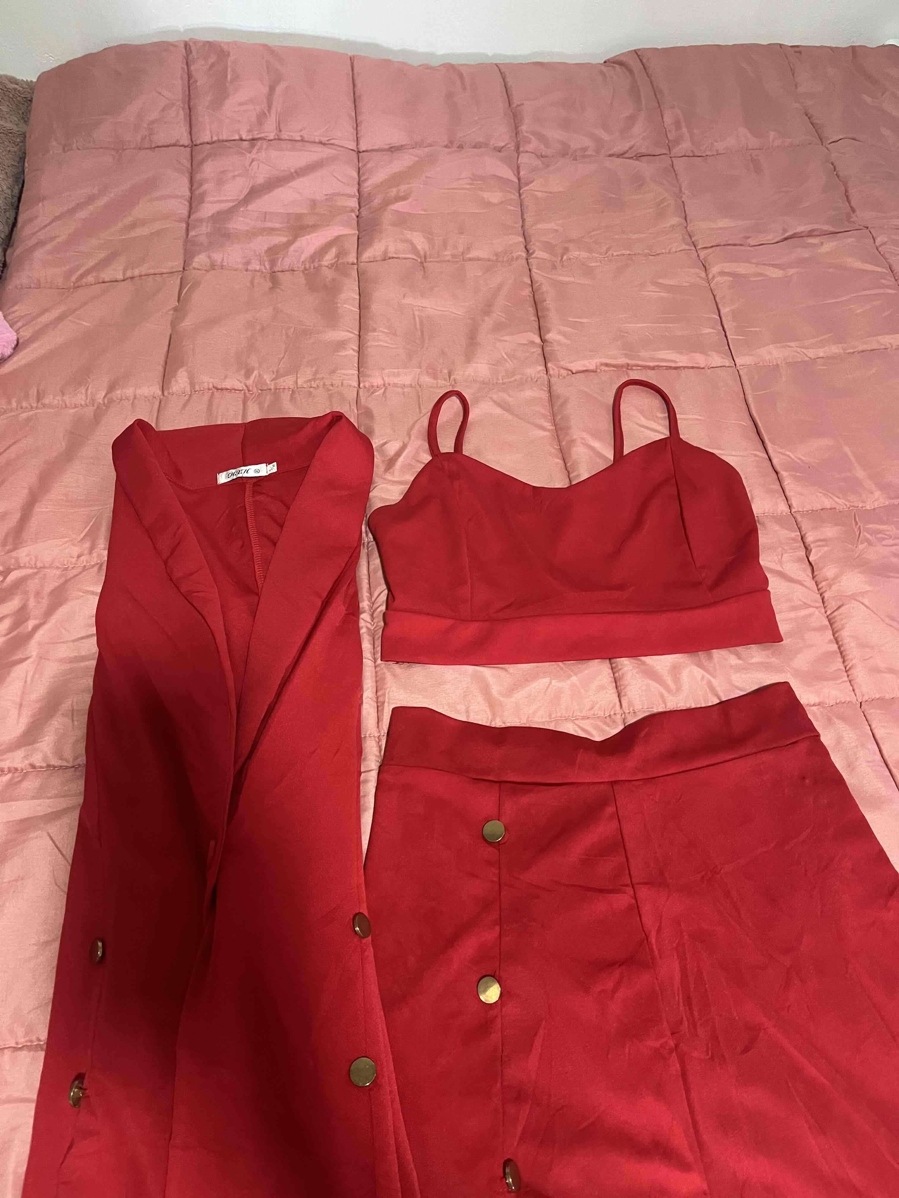 Elegante conjunto rojo de tres piezas, ideal para ocasiones especiales. En buen estado y cómodo para usar.