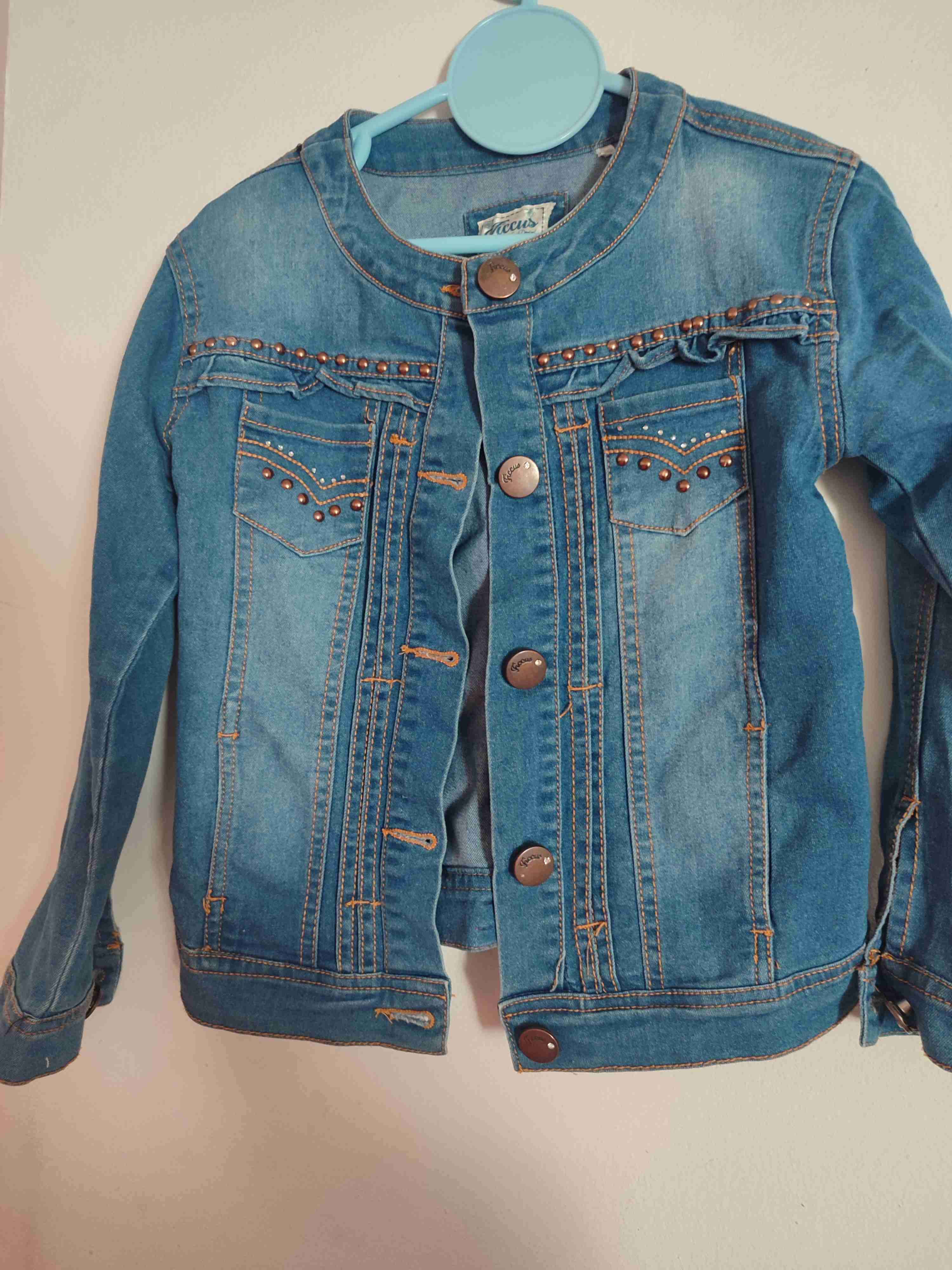 Chaqueta de mezclilla azul con detalles de remaches. Excelente estado, ideal para ocasiones casuales. Talla 6. Marca Ficcus.
