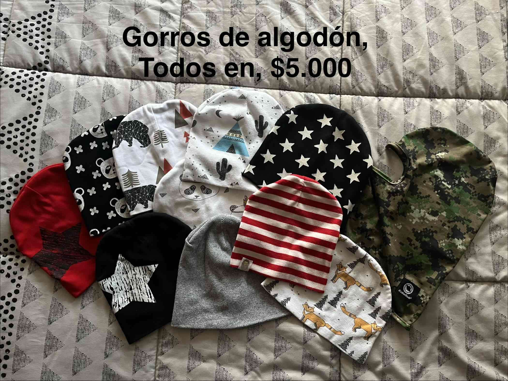 Gorros de algodón en varios diseños divertidos. Ideales para mantener a los niños abrigados con estilo. Excelente estado.