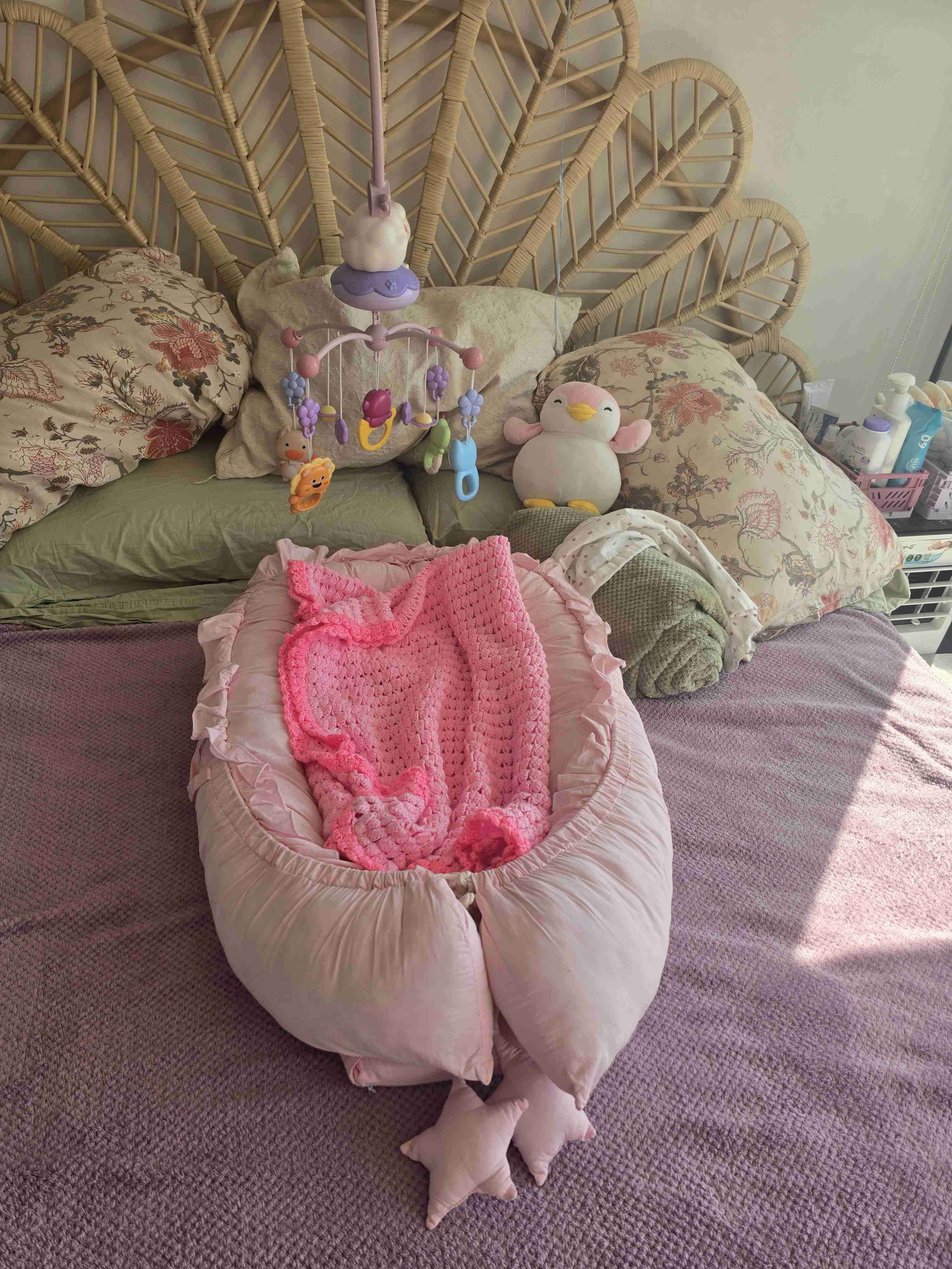 Cuna nido suave de algodón, ideal para la siesta del bebé. Color rosado con detalles. En buen estado. Incluye una cuña anti cólicos para que la bebe esté inclinada.