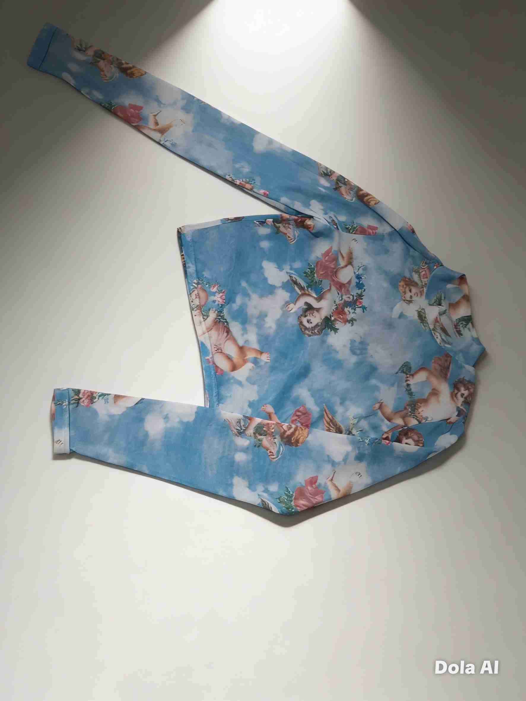 Polera con diseño de ángeles en un cielo azul. En buen estado, ideal para estilo casual.