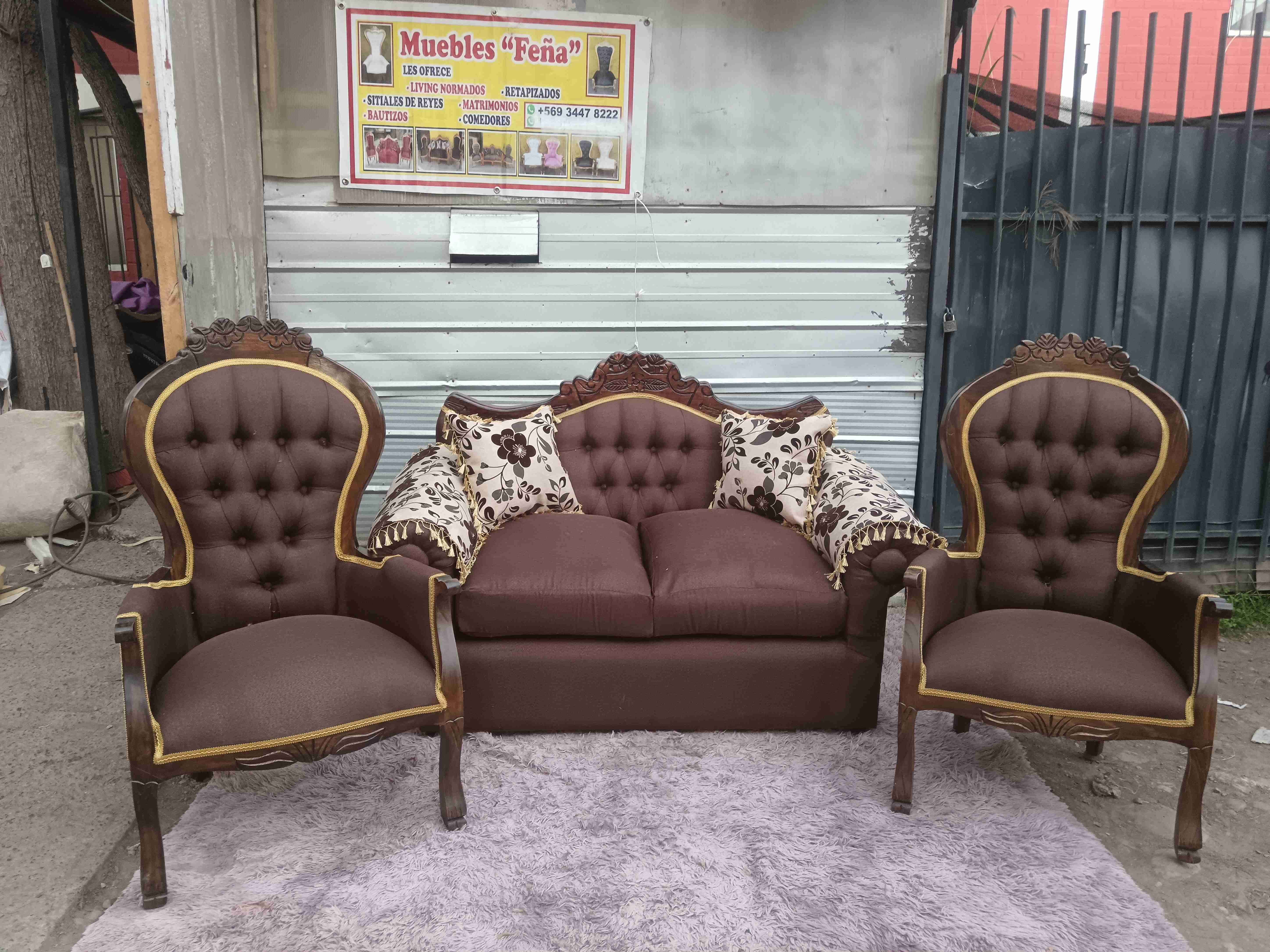 Juego de sillones estilo clásico en color marrón. Incluye dos sillones grandes y un sofá, perfectos para la sala de estar. En buen estado general.dudas o consultas al 944872240