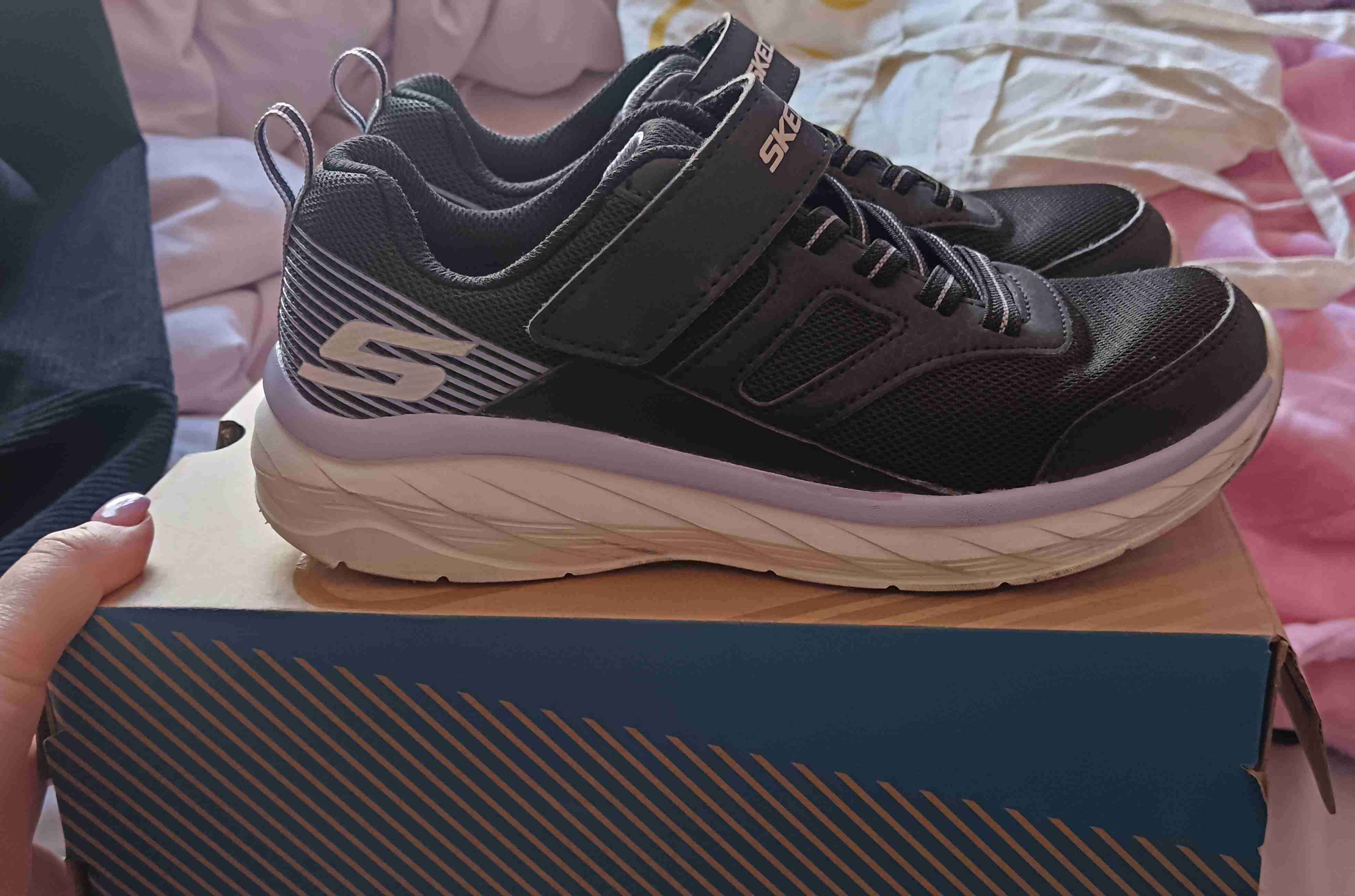 Zapatillas negras de Skechers con cierre de velcro. Ideales para actividades deportivas. Talla 33