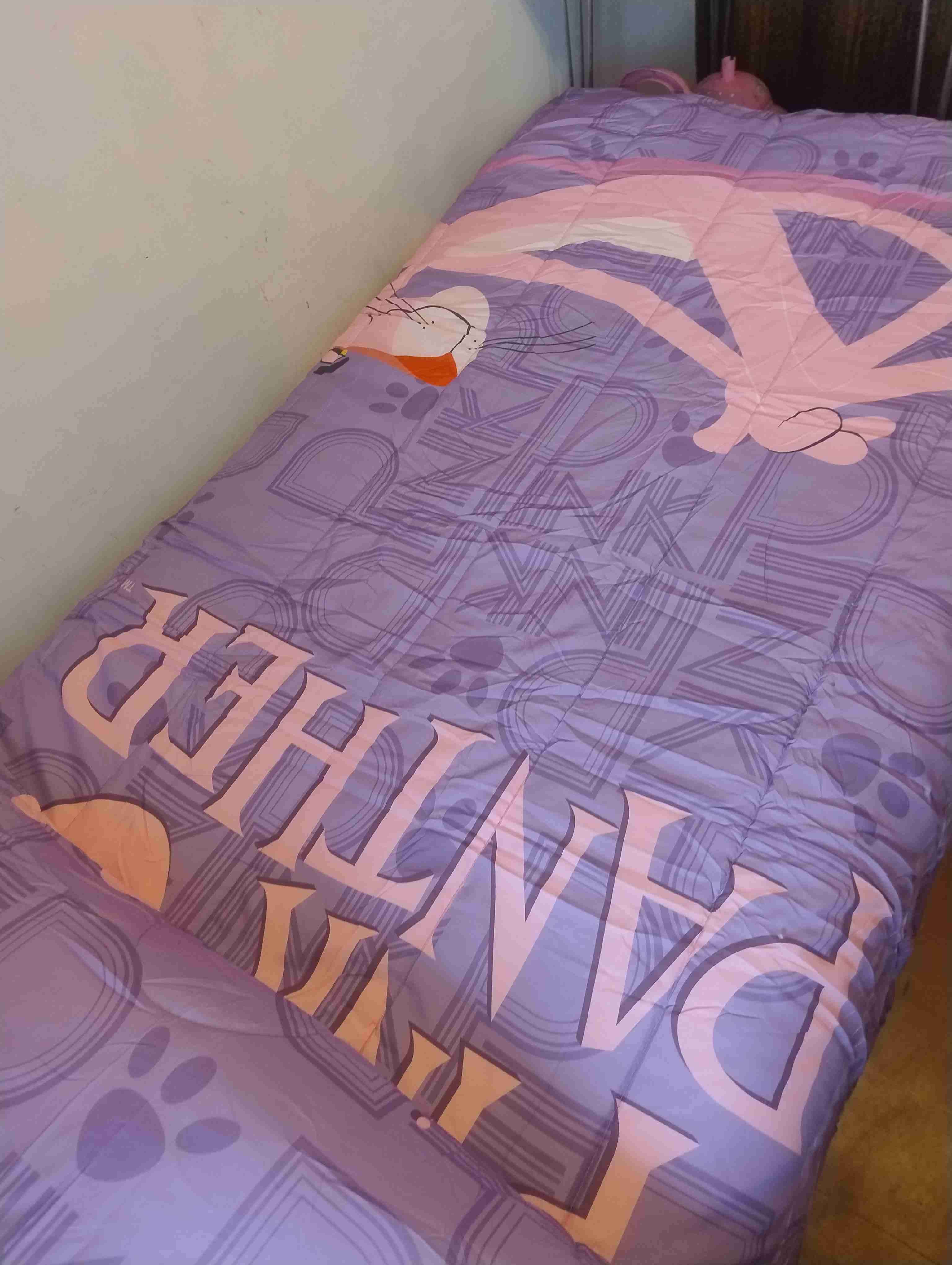 Colcha infantil con diseño de la Pantera Rosa en color morado. Ideal para decorar camas infantiles,por el revés con sharpe