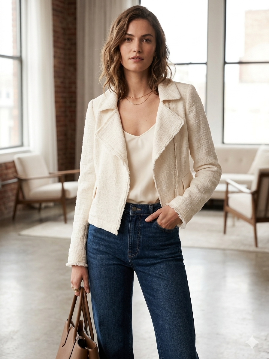 Chaqueta beige de estilo elegante, perfecto para ocasiones formales. En buen estado, con un diseño moderno y versátil.