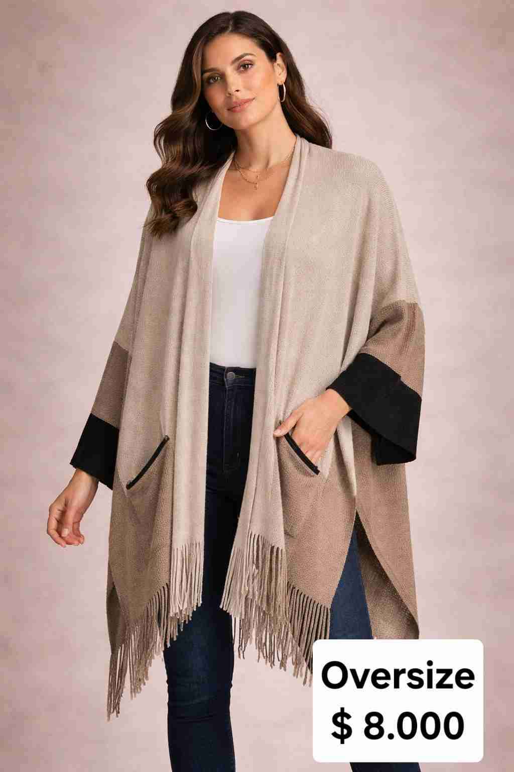 Poncho beige con flecos, estilo casual. Talla oversize, ideal para el invierno.