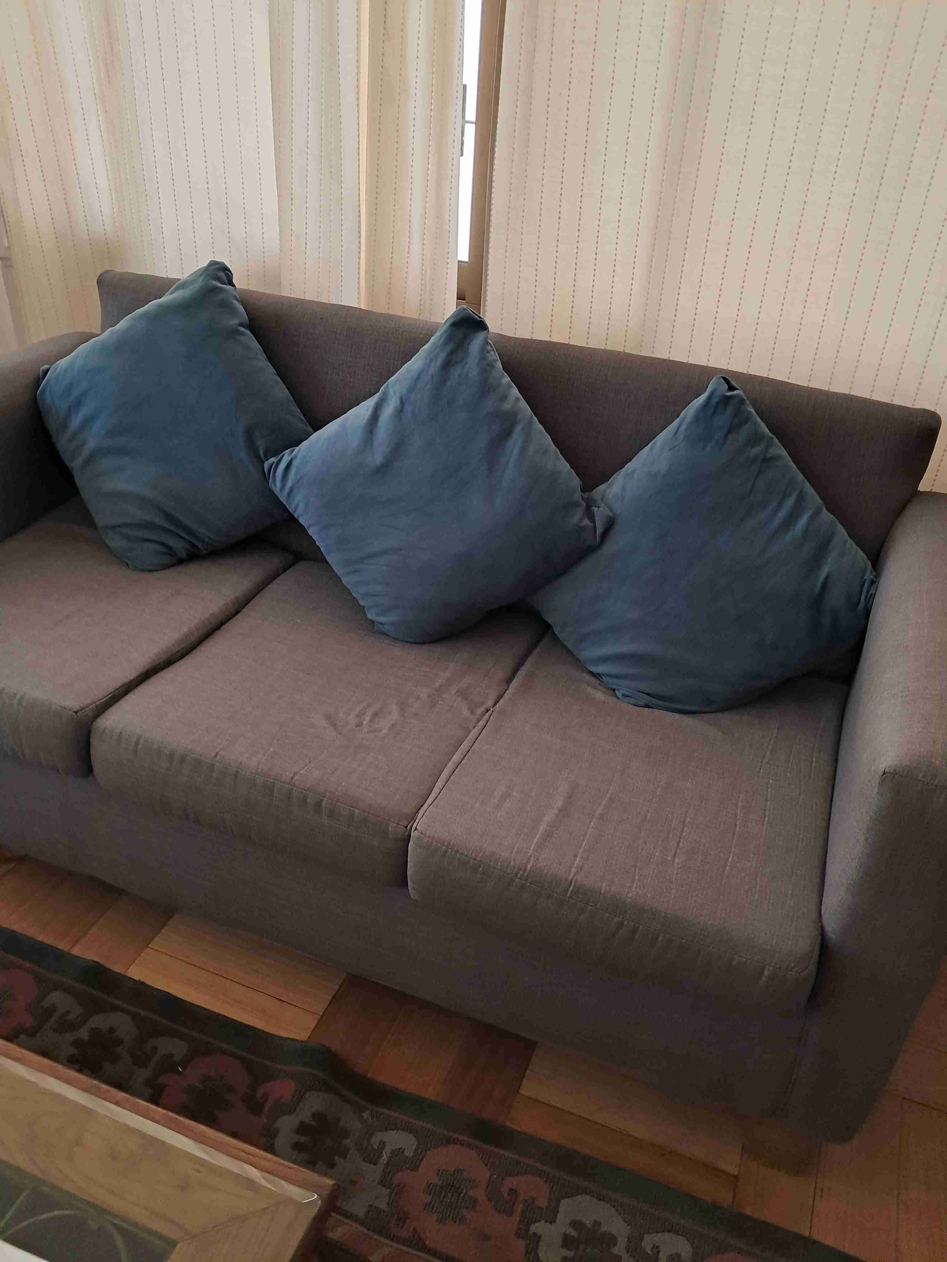 Cómodo sofá de tres plazas en color gris con cojines azules. Ideal para sala de estar o living. En buen estado general. Flete $10 mil varias comunas Stgo