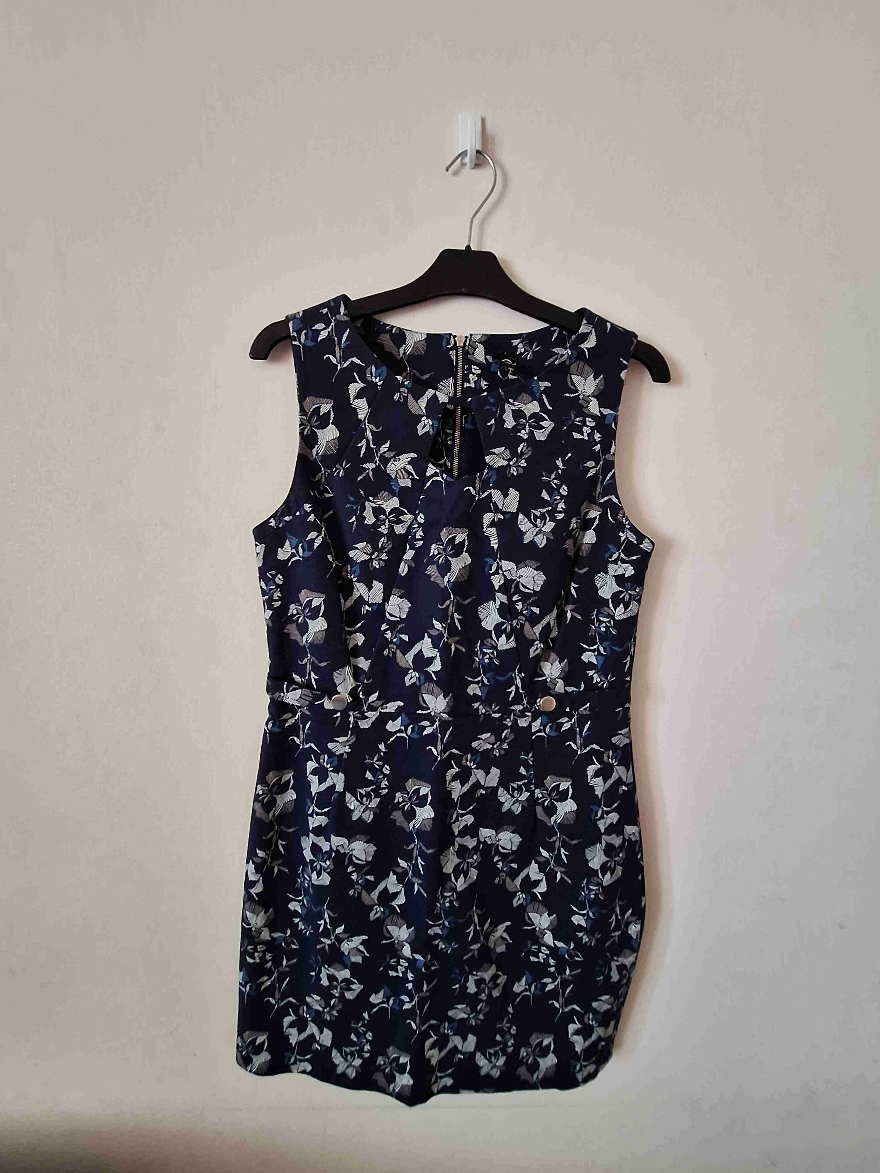Elegante vestido floral azul con blanco, ideal para salidas casuales o formales. En buen estado.