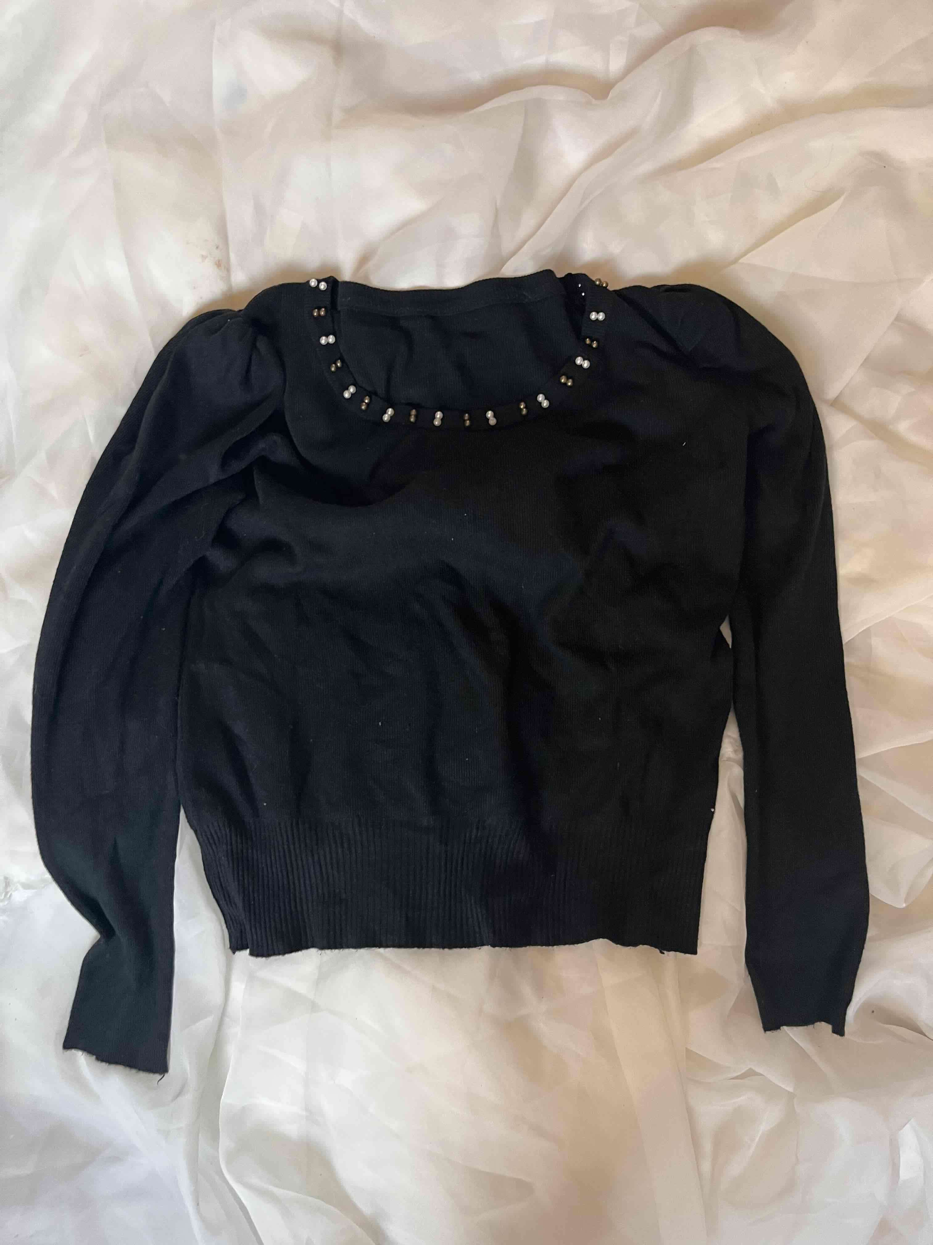 Elegante suéter negro con detalles de perlas en el cuello. Ideal para ocasiones casuales o formales.